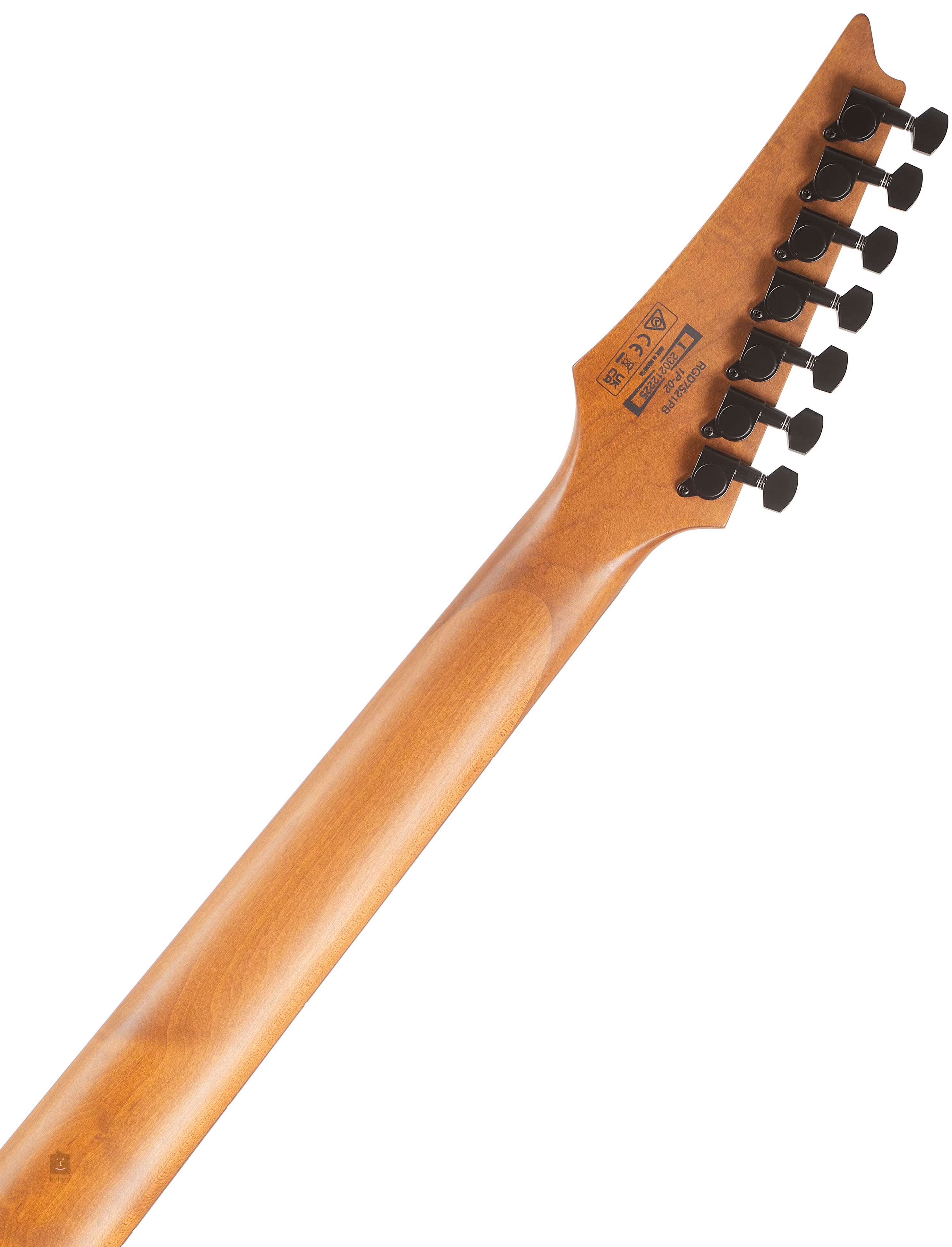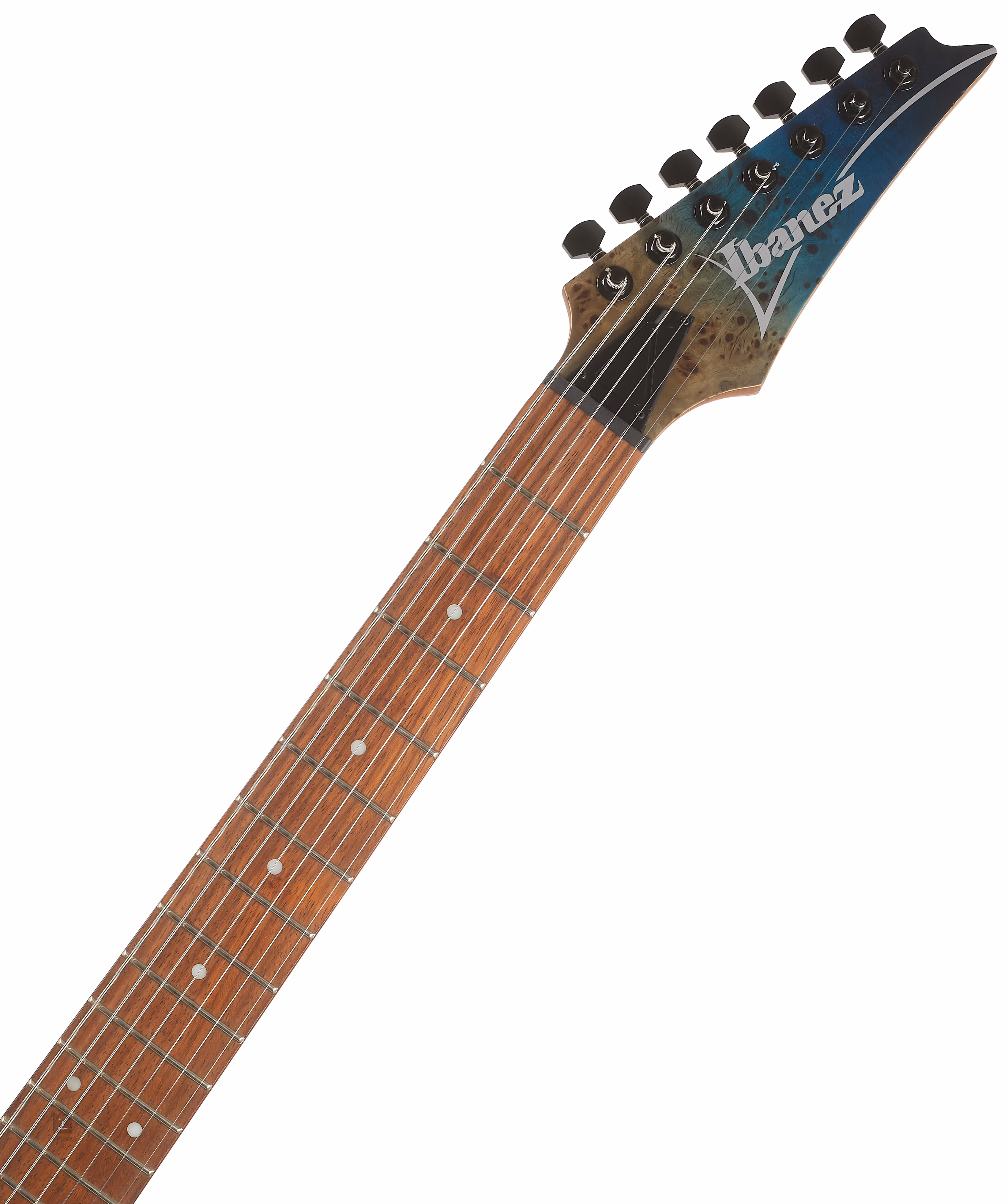 Le corps de la guitare sept cordes RGD7521PB-DSF est fabriqué a partir de bois exotique nyatoh et d'un placage spectaculaire de racines de peuplier. Une touche en jatoba avec vingt-quatre frettes jumbo est collée sur un manche rapide et étroit en érable avec un profil Wizard II-7. Le traitement thermique du manche en érable renforce ses caractéristiques tout en donnant a la guitare l'aspect et le toucher d'un instrument mature/joué. Les points de position blancs permettent de se repérer facilement sur la surface de la touche.