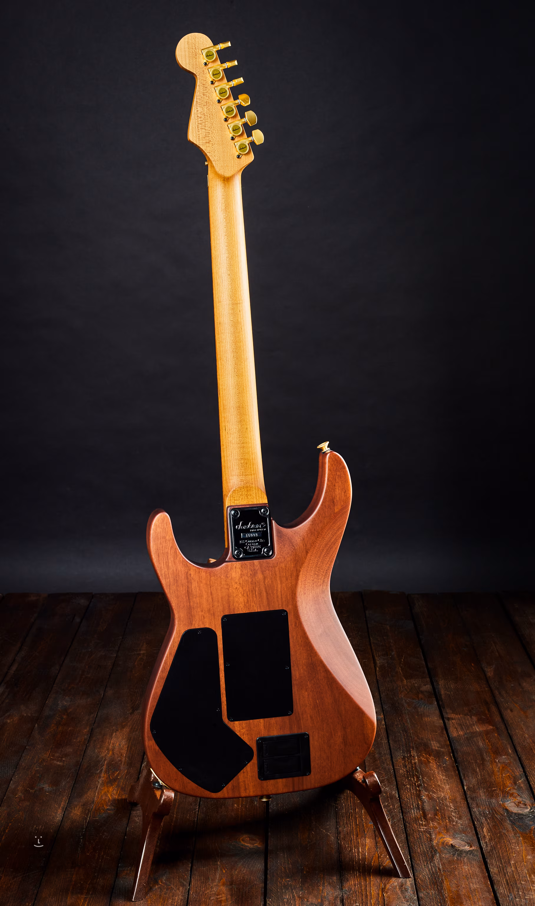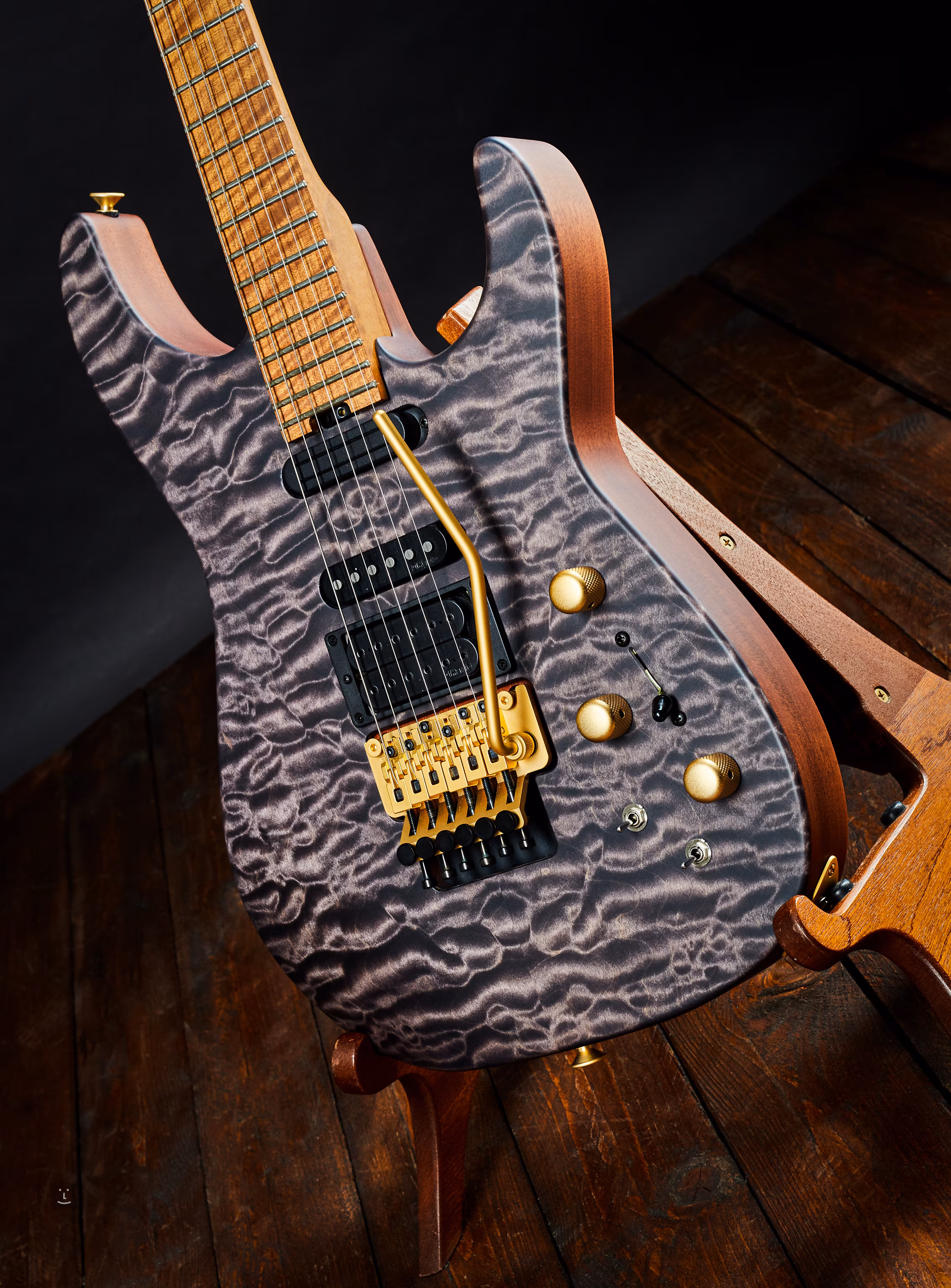 Il s'agit d'une superstring avec l'excellent et éprouvé trémolo Floyd Rose. Le corps est en acajou caramélisé avec une table en érable flammé. Le manche est en érable flammé caramélisé en quart de scie. La touche est en érable cuit avec 24 frettes jumbo et un rayon de 12 à 16 pouces. DiMarzio® Super 3™ DP-152-F (tête), DiMarzio HS-2™ DP116 (milieu), PC1 Sustainer Driver (manche). L'accastillage est de couleur dorée.