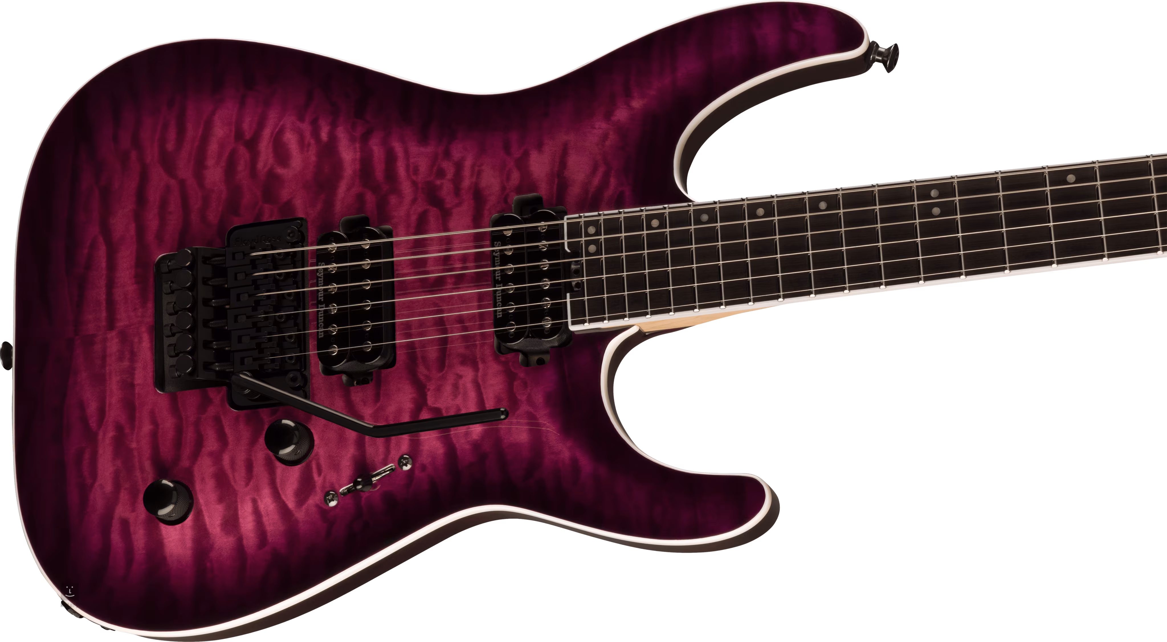 Le corps arqué de la guitare électrique okoumé Dinky DKAQ Transparent Purple Burst de la série Pro Plus est orné d'un placage spectaculaire en érable soufflé et d'une impressionnante finition Transparent Purple Burst. Une touche en ébène munie de 24 frettes jumbo en acier inoxydable est collée sur un manche en érable et noyer en cinq parties, renforcé par un barrage en graphite. Le rayon combiné de la touche permet à la fois un riffing confortable à la frette zéro et un shreding ultra-rapide aux frettes supérieures. L'orientation sur la surface de la touche est facilitée par des repères de position décalés en imitation nacre et des points luminescents sur le côté, qui vous garantissent une visibilité parfaite même dans les zones les plus sombres de la scène.