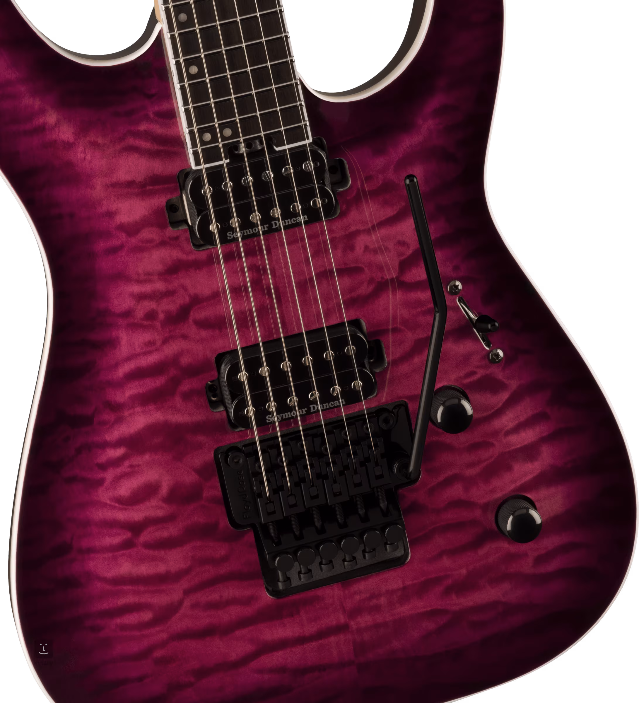 Les cordes sont logées dans les mécaniques de l'entreprise et le trémolo Floyd Rose 1000 Series. La guitare est livrée dans un sac de transport.