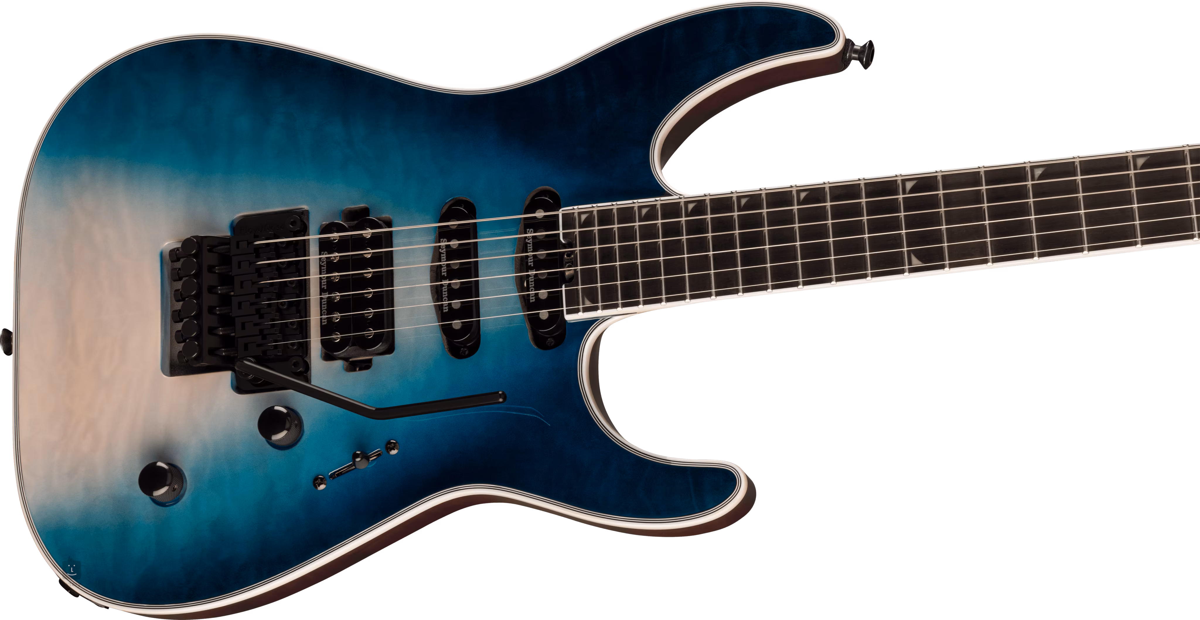 La guitare Soloist SLA3Q Polar Burst de la série Pro Plus est constituée d'un corps en okoumé arqué, d'un placage en érable ondé et d'un manche composé de trois pièces d'érable et de noyer renforcées par un barrage en graphite. Cette solution a un effet positif sur le sustain de l'instrument. La touche en ébène est équipée de vingt-quatre frettes jumbo en acier inoxydable. Le rayon combiné de la touche permet à la fois de jouer confortablement des riffs à la frette zéro et de s'adonner à un shred ultra-rapide dans les positions supérieures. Les repères de position en imitation nacre (dent de piranha) et les points luminescents sur le côté facilitent la navigation sur la surface de la touche, offrant une visibilité parfaite même dans les zones les plus sombres de la scène.