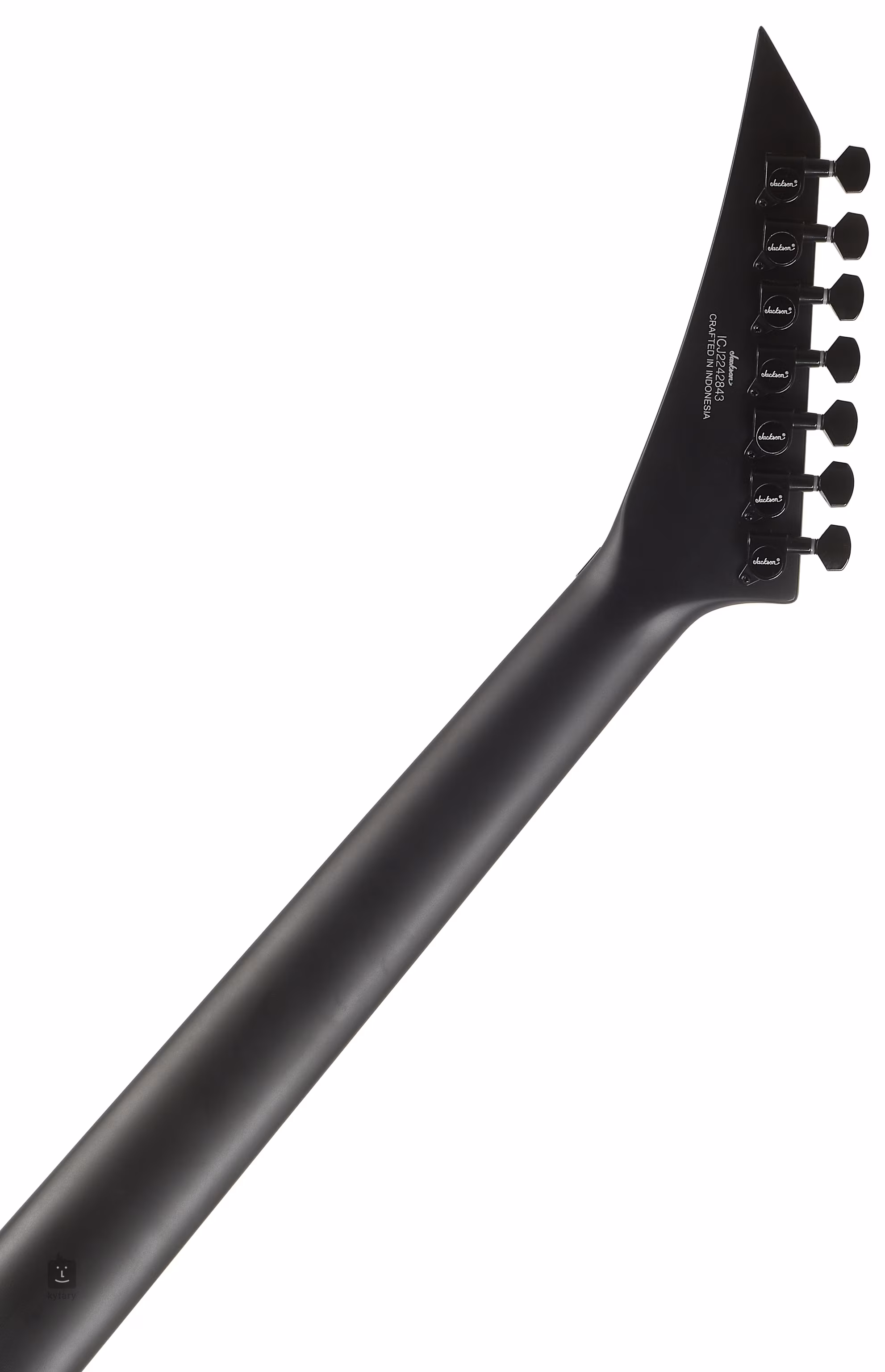La construction de cette guitare a sept cordes est composée d'ailes de corps en peuplier et d'un manche en érable moulé renforcé par des barrages en graphite. Cette conception a un effet positif sur le sustain de l'instrument. La touche en figuier est équipée de vingt-quatre frettes jumbo-size. Son rayon s'aplatit vers le corps - permettant a la fois un jeu de riff confortable a la frette zéro et un shred ultra rapide dans les positions supérieures. Les reperes de position en nacre imitation sharkfin permettent de naviguer facilement sur la surface de la touche.