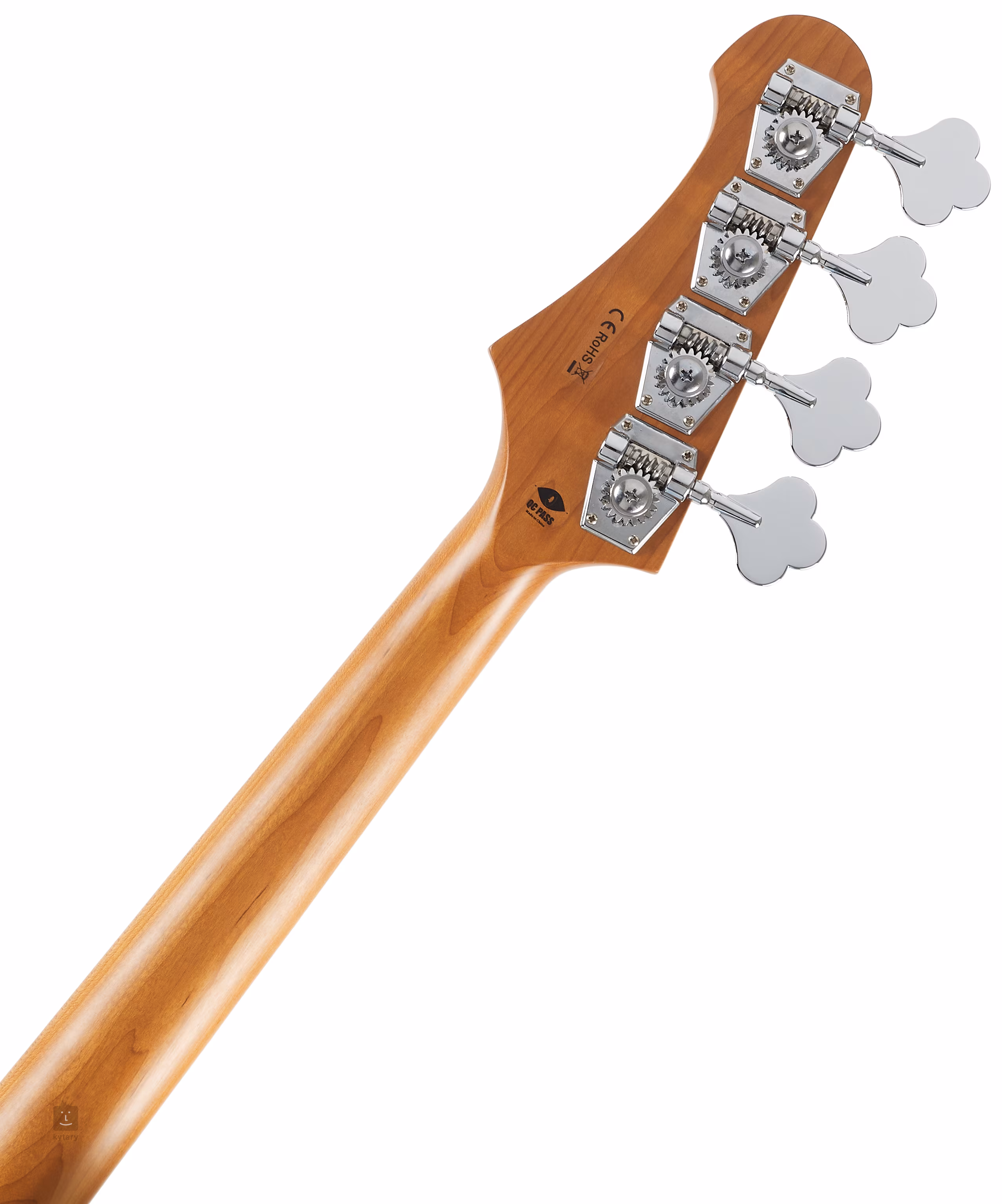 La basse est équipée de deux micros de type JB. Vous pouvez régler le caractère du son à l'aide des commandes de volume du micro et du potentiomètre du diaphragme de tonalité. Les cordes sont montées sur des mécaniques chromées de style vintage et un cordier à quatre selles. La finition élégante est accentuée par le pickguard imitation écaille de tortue et le logo de l'entreprise sur la tête.