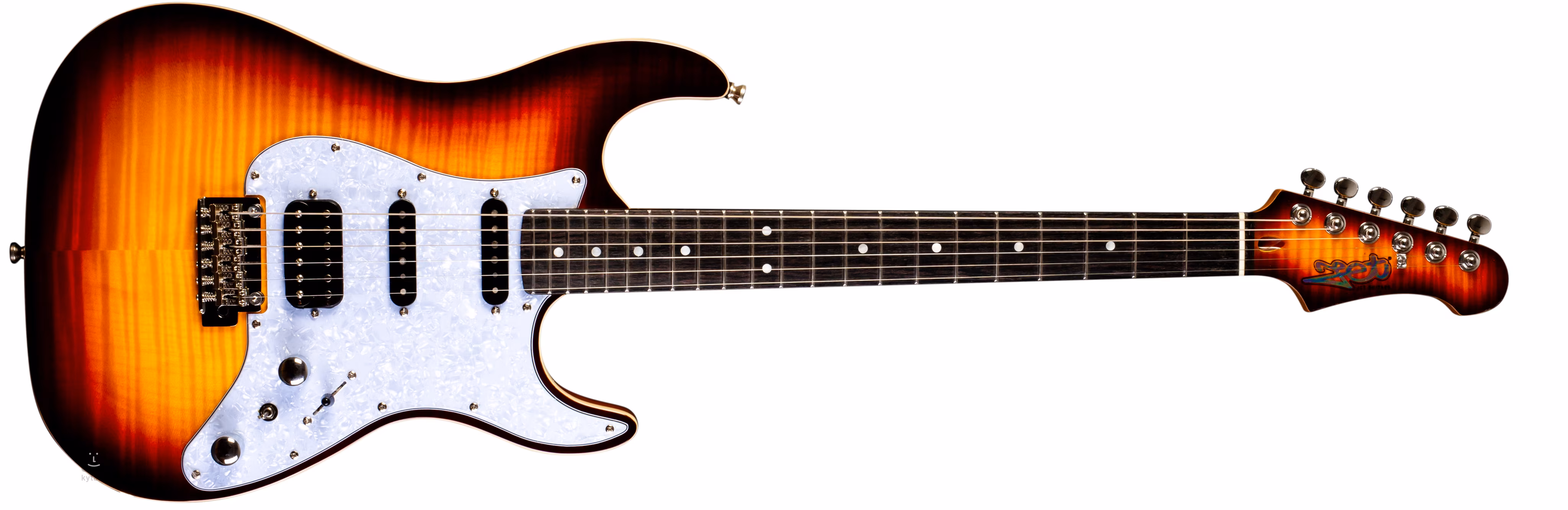 La combinaison d'un micro humbucker cobbler et de deux micros à simple bobinage avec aimants Alnico confère à la guitare une large palette de sonorités adaptées à une grande variété de genres musicaux. Le potentiomètre de volume, l'obturateur de tonalité et le commutateur de micro à cinq positions permettent de façonner le caractère du son. Les cordes sont ancrées par une frette en os dans des mécaniques chromées et un trémolo à deux points. Le look élégant est accentué par le pickguard en imitation nacre.