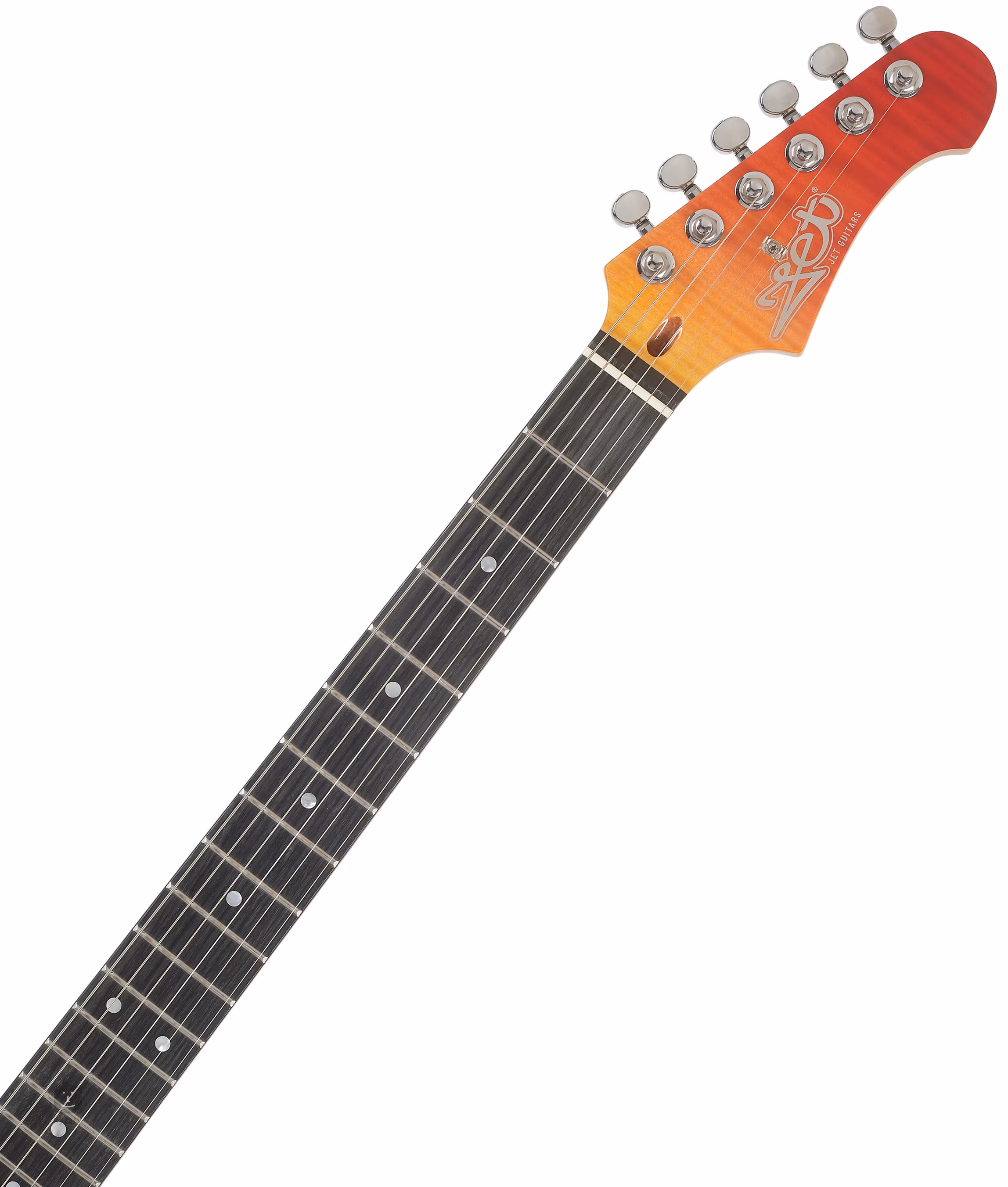 La guitare électrique JET JS-600 TRS est un modèle ST/Super ST plus moderne. Le corps en acajou de l'instrument est décoré d'un placage spectaculaire en érable plaqué. Une touche en ébène mixte de vingt-deux frettes est collée sur un manche en érable canadien grillé boulonné.