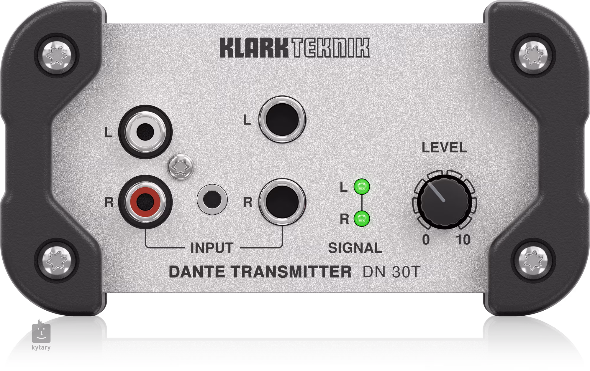 Transmetteur audio à deux canaux pour connecter des instruments, des microphones et des appareils de niveau ligne à un réseau Dante. Il offre une connexion automatique aux récepteurs Dante tels que le Klark Teknik DN 30R, des convertisseurs N/A à 96 kHz, des entrées analogiques 2x jack 6,3 mm TRS, 2x RCA, jack 3,5 mm TR et un châssis en aluminium avec des coins en caoutchouc pour une sécurité accrue de l'émetteur. Le matériel de montage est inclus pour une installation fixe de l'émetteur.