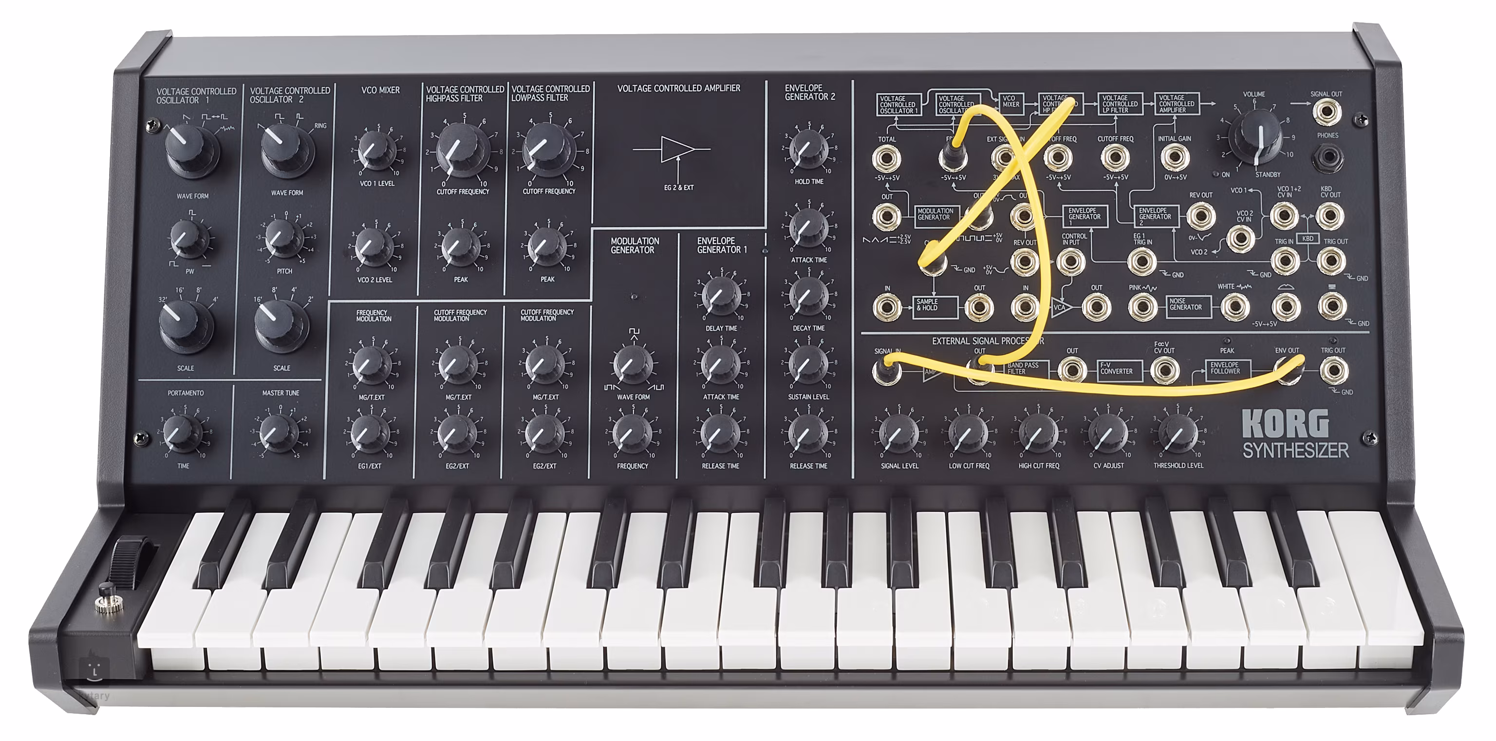 Processeur de signaux externes (ESP) pour le traitement des signaux externes. ESP reflete l'esprit expérimental du MS-20 original ; il vous permet d'utiliser la hauteur ou le volume d'une source audio externe pour contrôler le synthétiseur. Par exemple, vous pouvez brancher une guitare électrique et utiliser le MS-20 mini comme un synthétiseur de guitare, ou brancher un microphone et l'utiliser comme un synthétiseur de voix.