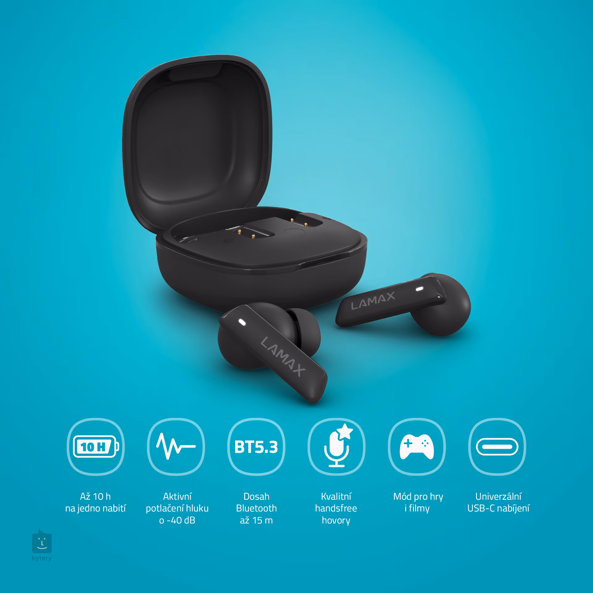 Les écouteurs intra-auriculaires sans fil LAMAX Clips1 ANC vous permettent d'échapper à la réalité de la vie quotidienne pour entrer dans votre propre monde. Offrant jusqu'à 10 heures d'autonomie (44 heures avec l'étui de chargement), le Bluetooth 5.3 avec une portée allant jusqu'à 15 mètres, une annulation du bruit ambiant (ANC) allant jusqu'à 40 dB grâce à trois microphones spéciaux dans chaque écouteur, un mode Transparence dans lequel les microphones augmentent le bruit ambiant afin que vous puissiez vous déplacer en ville tout en restant vigilant, des commandes tactiles intuitives, un mode gamer, un son cristallin avec la technologie LAMAX BeatBass améliorée par le codec AAC de haute technologie, des microphones de haute qualité, la charge USB-C, la résistance à la sueur et à l'humidité et la prise en charge des assistants vocaux Siri et Google Assistant.