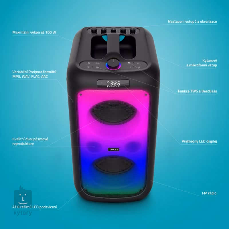 Le LAMAX PartyKing1 Plus est un haut-parleur portable moderne d'une puissance de 100 W qui deviendra facilement le roi de tout événement. Il ne vous mettra pas dans l'embarras lors de votre mariage au lycée, il permettra à toute la rue d'être au courant de votre garden-party et il vous fera passer à la vitesse supérieure à la salle de sport. Oh, et vous pouvez chanter et jouer de la guitare avec. Grâce à la conception à double bande, à l'égaliseur et à la technologie BeatBass® avancée, vous profiterez de basses profondes qui donneront sans aucun doute le ton.