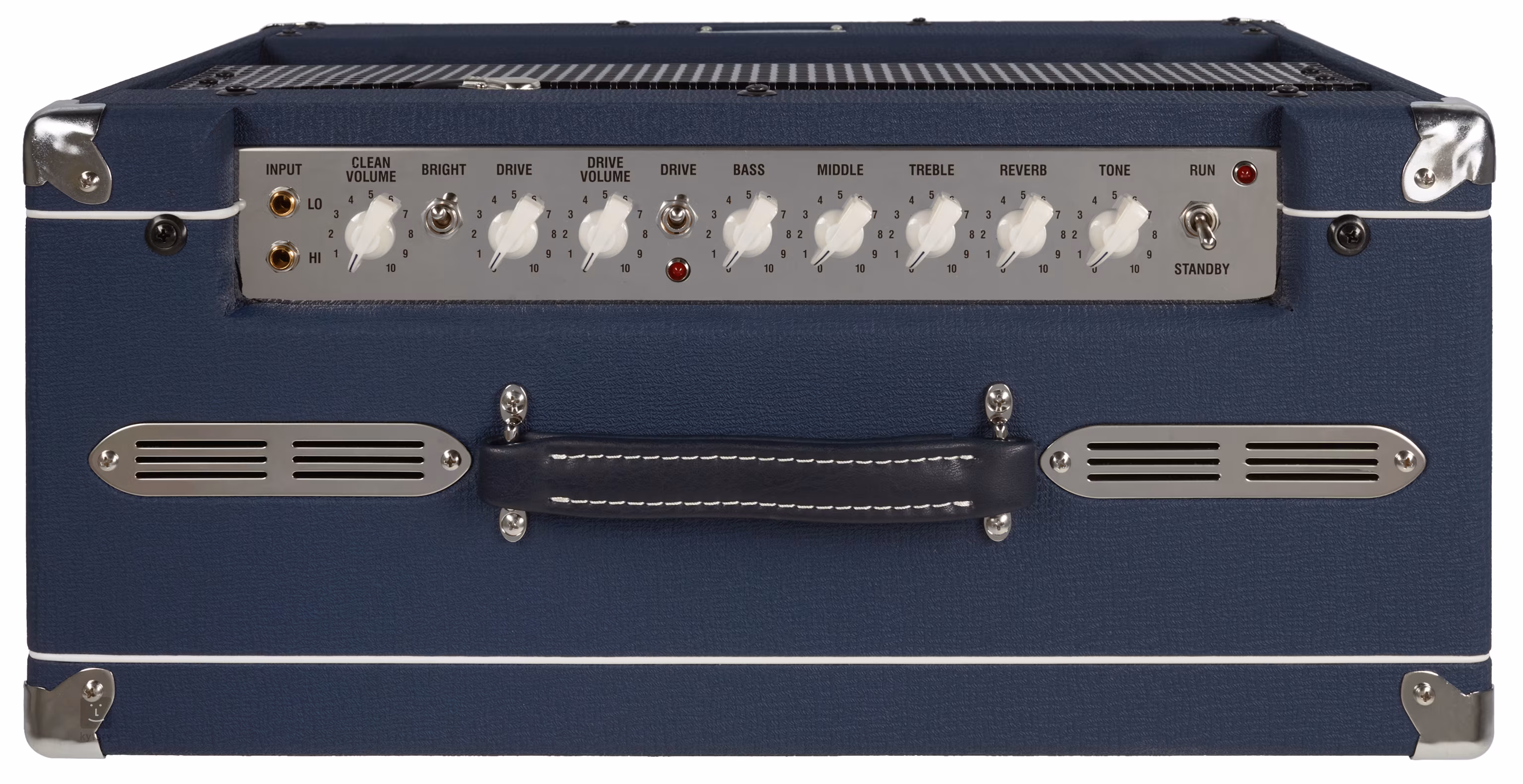 Sur son panneau de commande, vous trouverez des potentiometres clairement disposés, qui sont précédés par des entrées Lo et Hi. Le premier contrôle est le potentiometre de volume pour le premier canal, suivi de l'interrupteur Bright et des contrôles Drive et Drive Volume pour le second canal - ce dernier est commuté par l'interrupteur Drive adjacent. Les deux canaux partagent un égaliseur 3 bandes et des potentiometres Tone et Reverb qui permettent de régler le niveau de la réverbération numérique intégrée.