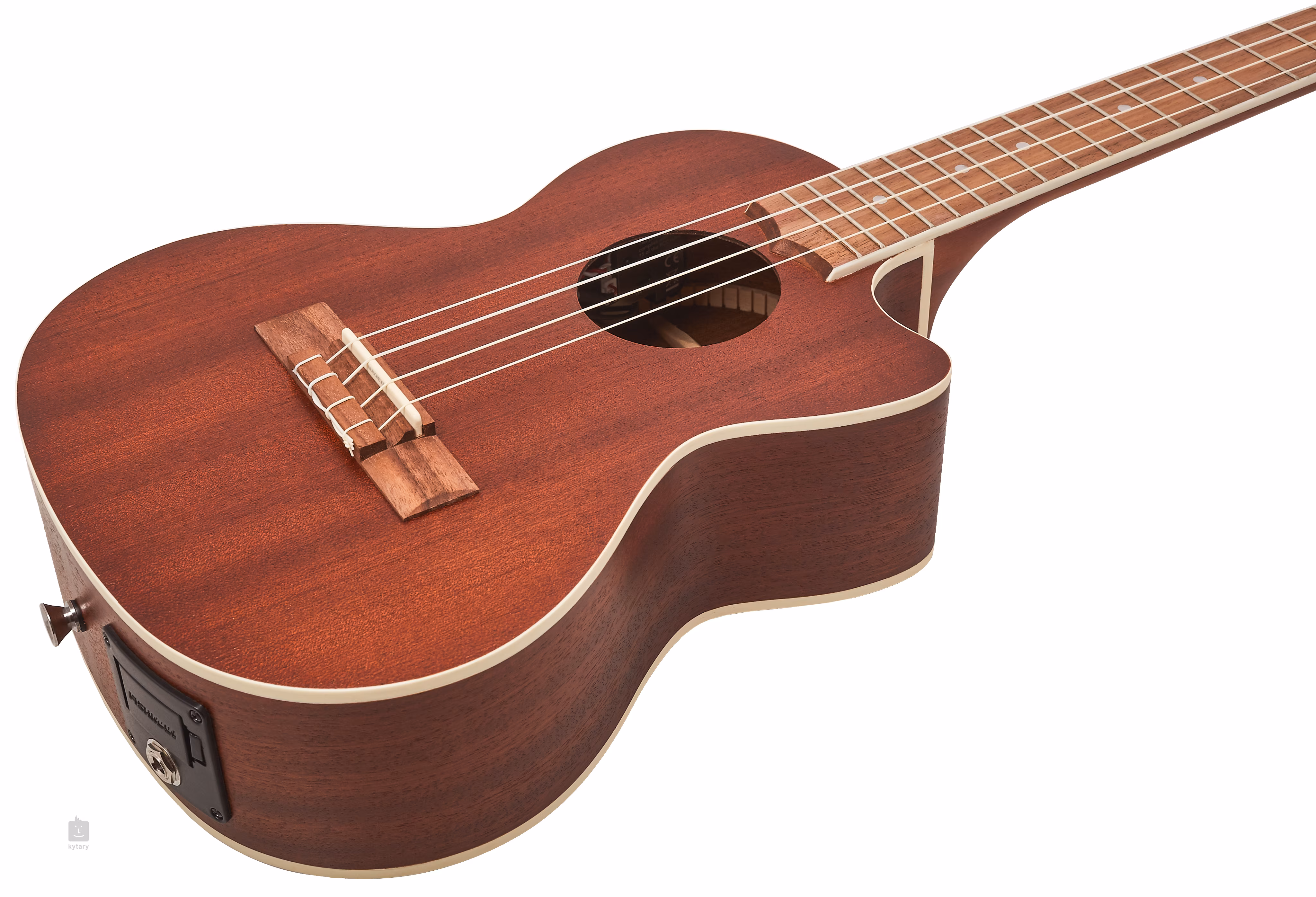 Le corps de cet ukulélé ténor est fabriqué en acajou superposé, ce qui confère à l'instrument un aspect traditionnel et une sonorité chaleureuse. La touche en noyer est dotée de dix-sept frettes, avec des repères de position pour faciliter l'orientation. Le manche plus large et la frette zéro de l'instrument offrent une sensation et un mouvement confortables de la touche, tandis que le sillet NuBone XB et la frette zéro assurent un bon maintien des cordes. La stabilité de l'accordage est garantie par les mécaniques chromées ouvertes de haute qualité. L'impression visuelle est accentuée par les garnitures (corps et touche) en ABS. L'ukulélé est livré avec une housse de protection d'une épaisseur de 5 mm.