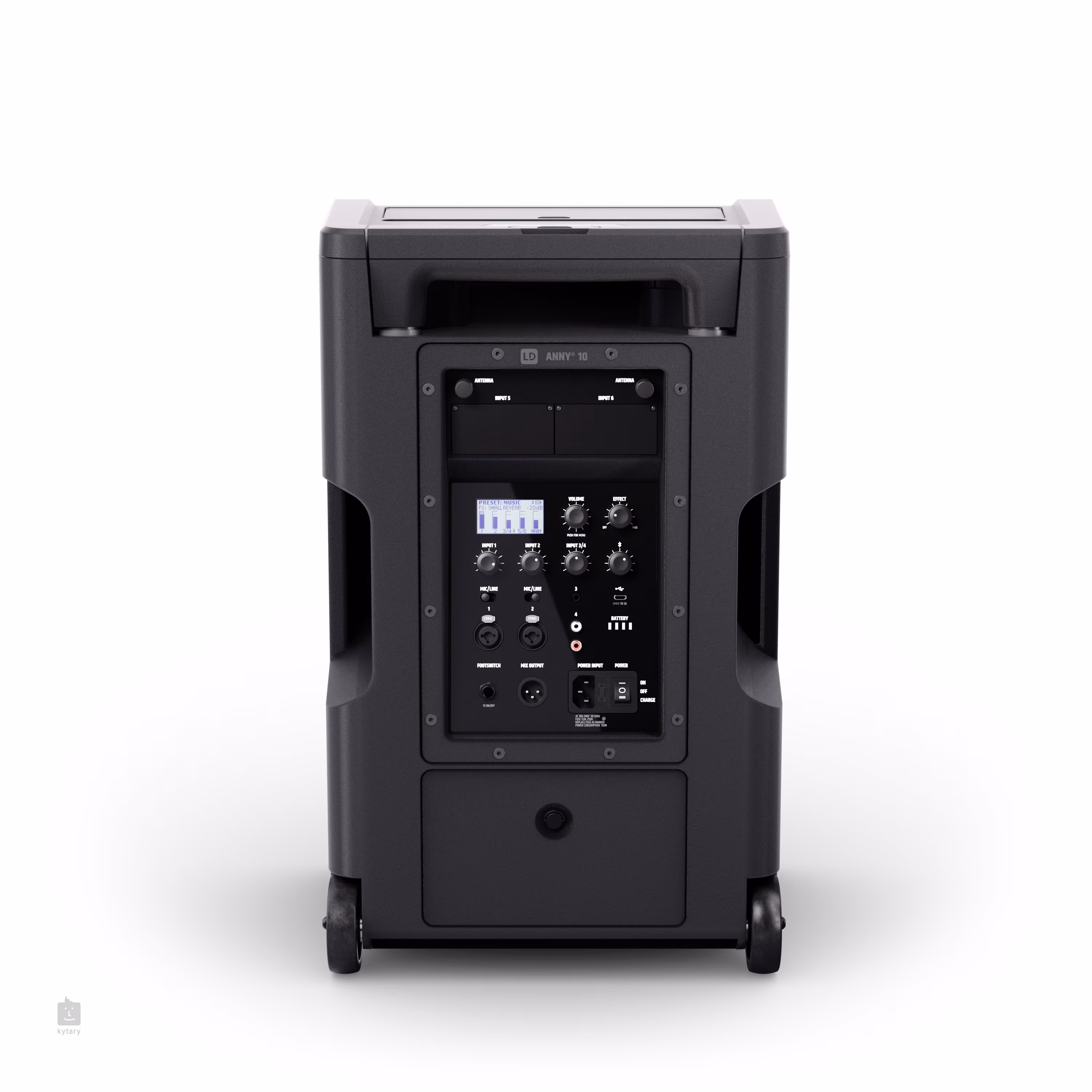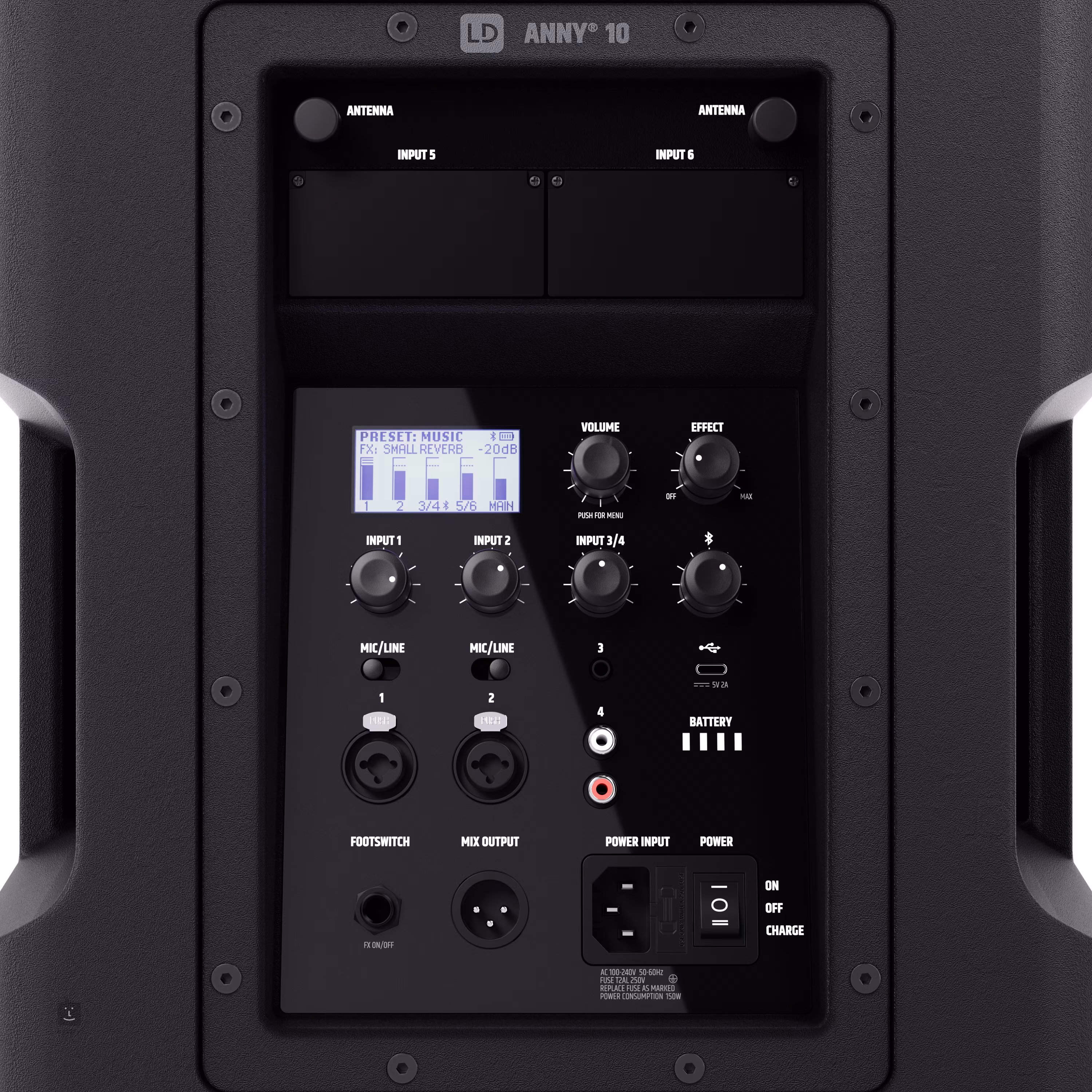 2x Combo XLR/Jack 6.3 mm (mic/line), 1x Jack 6.3 mm, 2x RCA, 1x Footswitch, Bluetooth