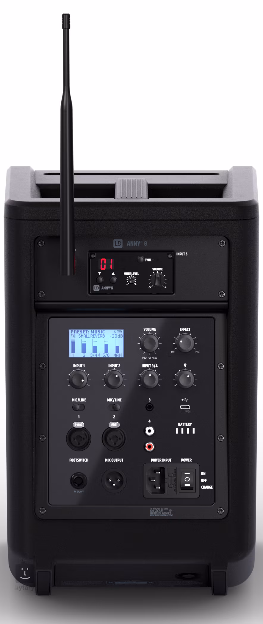 2x Combo XLR/Jack 6.3 mm (mic/line), 1x Jack 3.5 mm (aux), 2x RCA, 1x Jack 6.3 mm (footswitch), Bluetooth