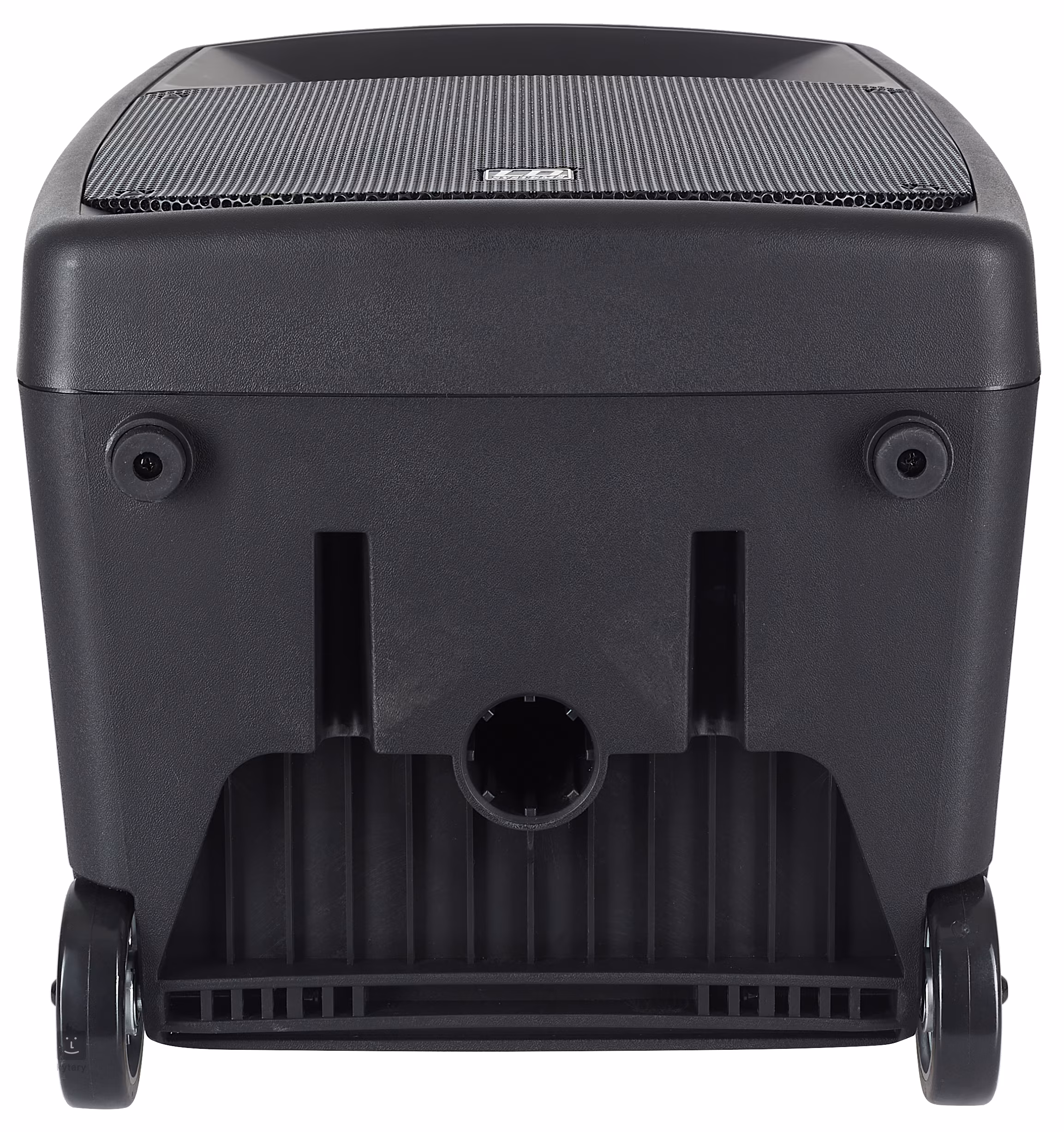 Des roulettes intégrées et une poignée télescopique facilitent le transport de la boîte a haut-parleurs, et il reste également de la place sur le panneau supérieur pour ranger jusqu'a deux microphones sans fil.