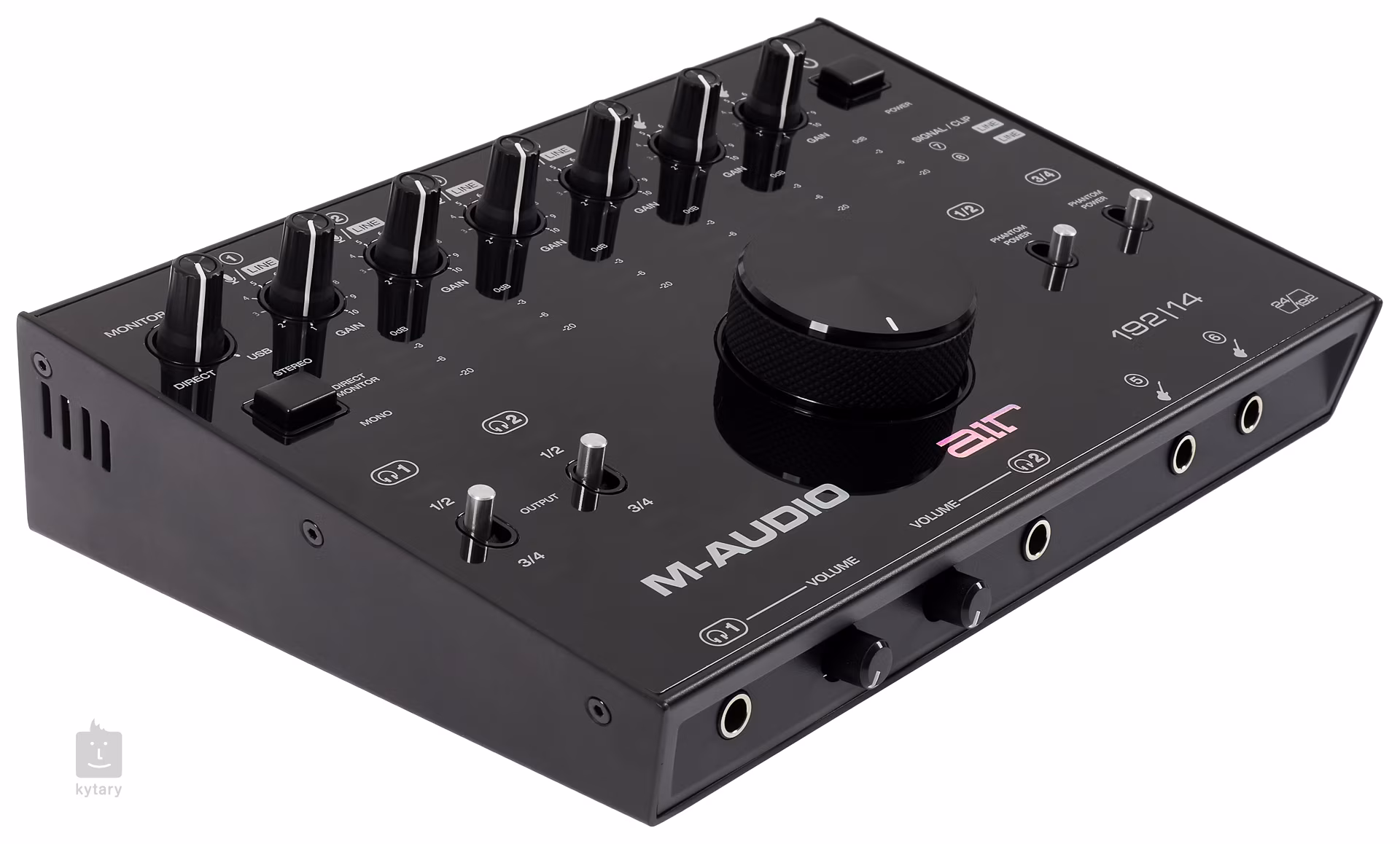 M-Audio AIR 192/14 La 192/14 est une carte son professionnelle à six canaux offrant une qualité sonore de 192kHz/24 bits. Elle est adaptée au monitoring détaillé pendant l'enregistrement ou la post-production de vos enregistrements. Le panneau avant comporte deux entrées pour instruments permettant de connecter des guitares et des basses, ainsi que deux sorties casque pour le travail de nuit et des commandes de volume de casque pour les deux canaux. Le panneau supérieur offre des commandes intuitives sous la forme de six potentiomètres de gain pour chaque canal, d'un bouton USB/Direct pour le mixage du signal d'entrée, d'un volumineux volume principal, d'un commutateur de signal mono/stéréo pour la sortie et d'un commutateur d'alimentation fantôme pour les entrées micro. L'arrière vous offre deux paires de sorties stéréo pour les moniteurs de studio ou la table de mixage, quatre entrées combo pour les microphones ou autres équipements musicaux, une entrée stéréo LINE pour les claviers, une entrée/sortie MIDI et un port USB (C) ultra-rapide pour le PC ou l'ordinateur portable. Deux câbles USB, deux réducteurs de connecteur MIDI à 5 broches et un logiciel sont inclus.