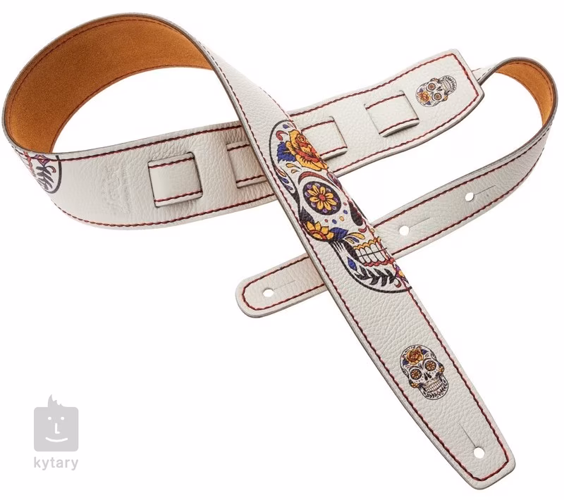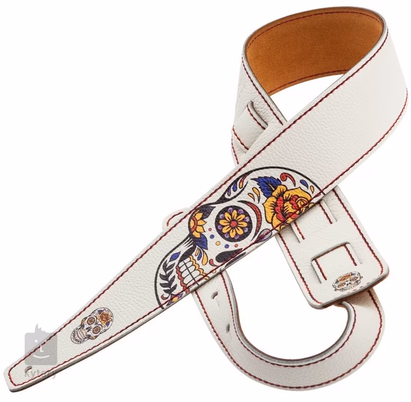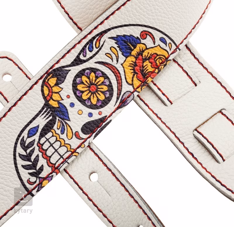 En même temps, elles sont dotées d'un système classique de réglage de la longueur par "trous", sans boucles ni parties métalliques qui pourraient compromettre la peinture de votre précieux instrument. Huit trous se trouvent sur toute la longueur, ce qui permet une adaptation parfaite aux besoins de chaque musicien. La sangle est fabriquée à la main en Italie et est décorée d'une tête de mort dans le style de la fête des morts mexicaine.