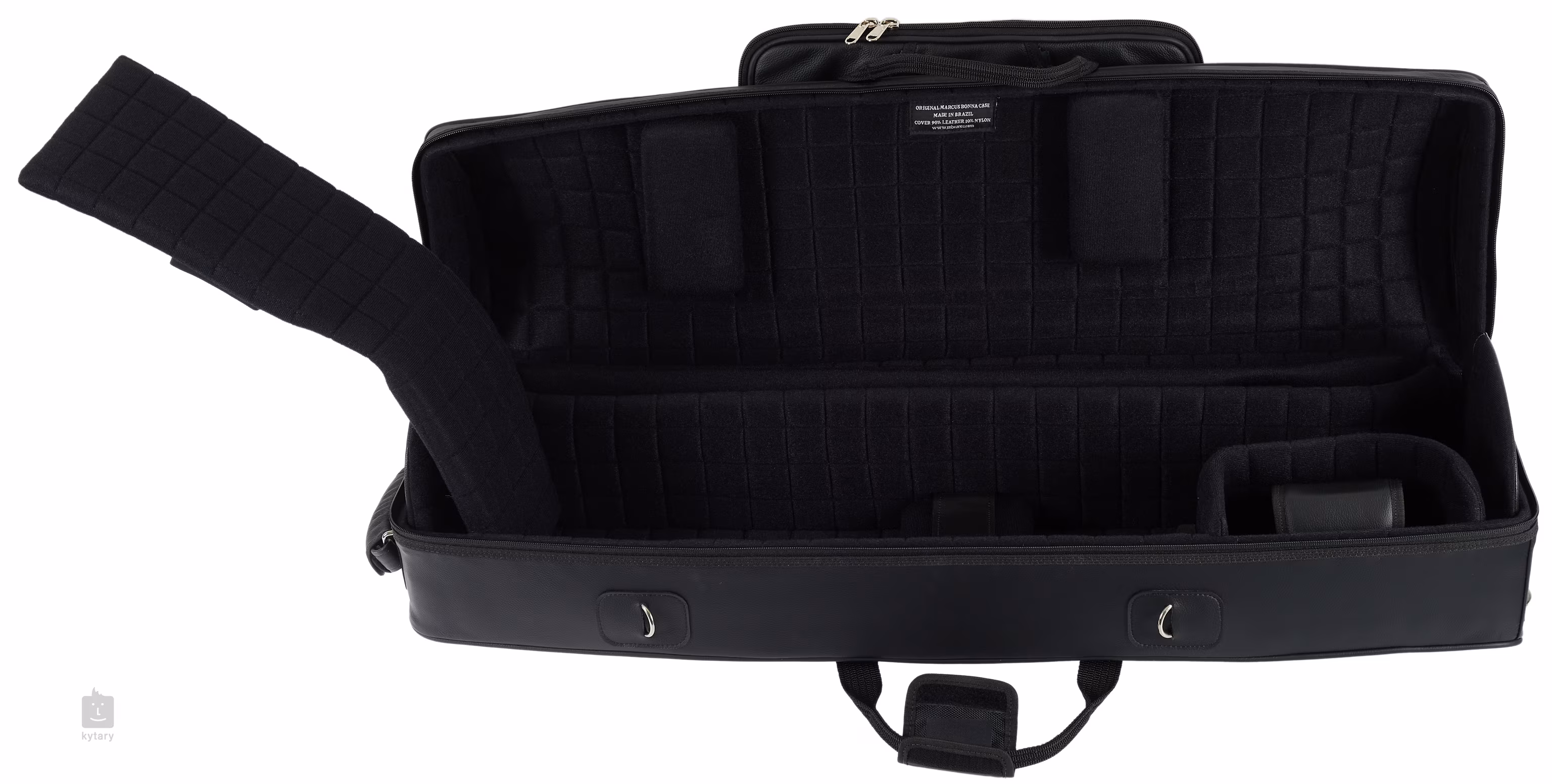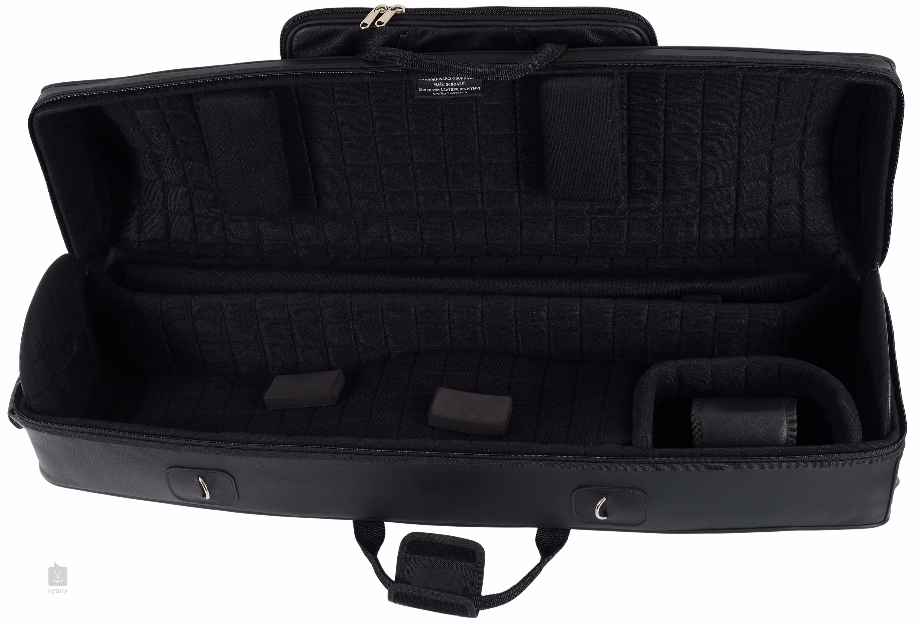 Étui Marcus Bonna pour deux trombones - spécialement conçu pour le trombone ténor jusqu'à 9 pouces (228 mm) de largeur de table d'harmonie et le trombone alto jusqu'à 7 1/8 pouces (182 mm) de largeur de table d'harmonie. La construction en fibre de verre ou de carbone est recouverte d'une coque en nylon à l'extérieur et de cuir à l'intérieur. Les corps des trombones sont séparés par un panneau de mousse dans l'étui, et les coulisses sont rangées dans des compartiments distincts. L'intérieur comprend également un compartiment avec une pochette pour trois embouchures. D'autres petits accessoires peuvent être rangés dans la poche extérieure amovible à fermeture éclair, qui sert également d'étui à musique.