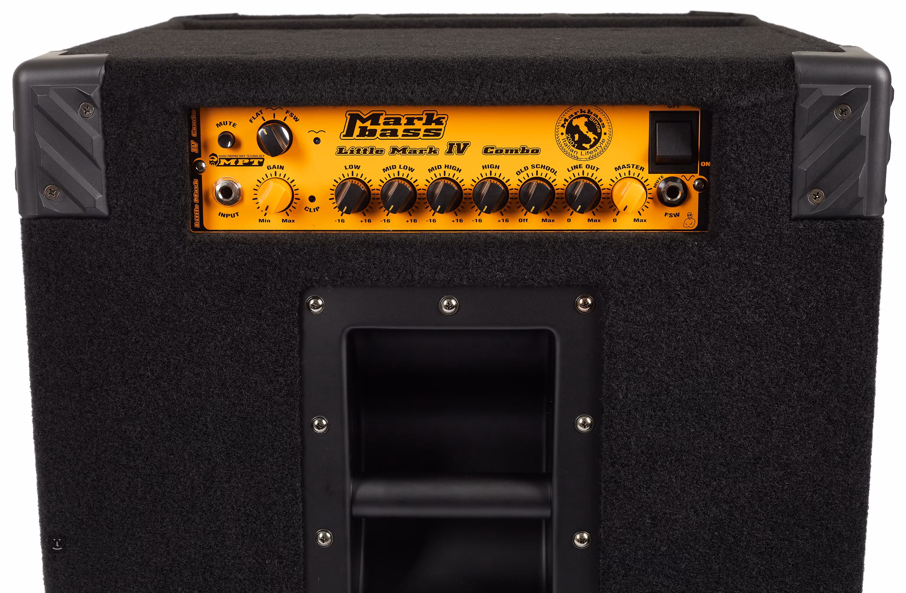 Le panneau arrière de l'appareil abrite les sorties haut-parleurs, sous la forme d'un jack 6,3 et d'un combo Speakon de Neutrik. Il est possible d'utiliser soit uniquement les haut-parleurs internes, soit uniquement le boîtier externe, et il est également possible de combiner les deux. À côté se trouve une sortie ligne pré/post-EQ avec commutateur Ground-Lift, et en dessous une sortie tuner asymétrique pour connecter un tuner, mais tout autre appareil ne nécessitant pas de signal symétrique peut être branché dessus. Les derniers éléments sont l'entrée et la sortie de la boucle d'effets parallèle, et sur le dessus se trouve également l'entrée de la pédale de commande.