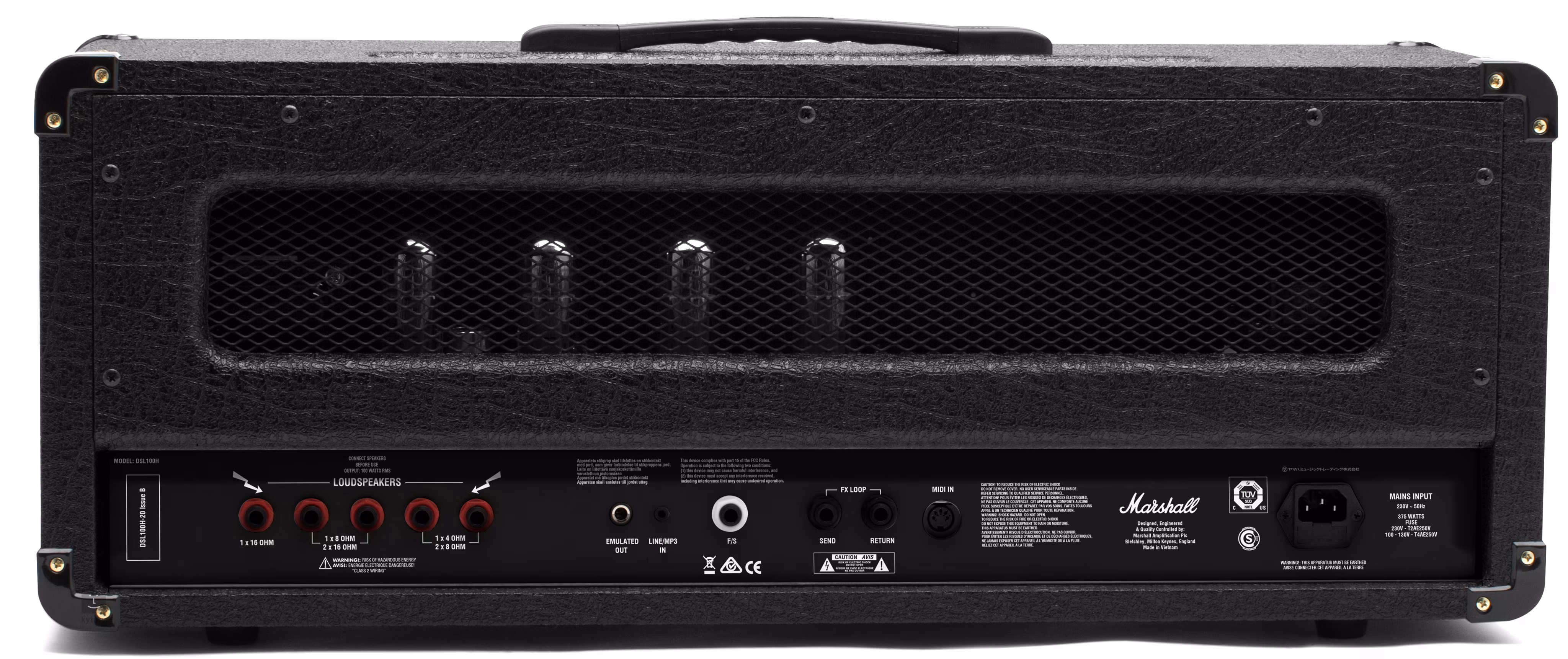 Sur le panneau arrière, l'amplificateur offre une fonction de boucle d'effets, une entrée pour pédale de commande (PEDL-90012 inclus ou PEDL-91016 doit être acheté), cinq sorties pour haut-parleurs externes avec 1x 4 OHM, 1x 8 OHM, 1x 16 OHM options de connexion, 2x 8 OHM et 2x 16 OHM, un connecteur MIDI IN pour connecter des appareils/contrôleurs MIDI, une entrée audio pour les sources MP3/audio externes et un connecteur Emulated Out qui peut servir de sortie casque ou de sortie directe de l'appareil vers le mixage. Une pédale de commande à deux broches est incluse, utilisée pour passer d'un canal d'ampli à l'autre et activer la boucle d'effets. Une pédale à six canaux avec des options de contrôle étendues peut être ajoutée à l'unité.