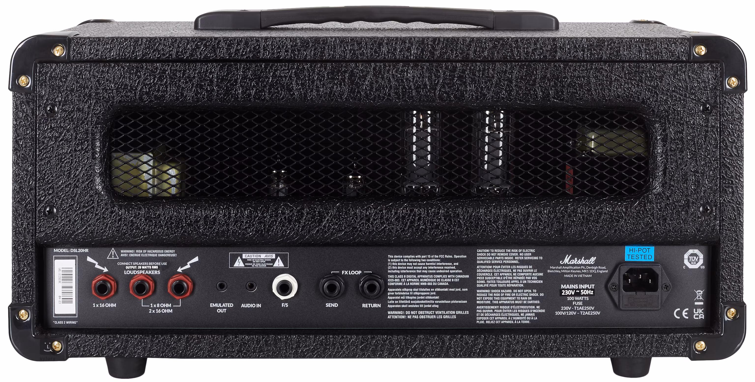 Sur le panneau arrière, l'ampli offre une fonction de boucle d'effets, une entrée pour pédale, trois sorties vers des haut-parleurs externes avec les options 1x 16 OHM, 1x 8 OHM et 2x 16 OHM, une entrée audio pour connecter des appareils MP3/audio externes et une prise Emulated Out qui peut servir de sortie casque ou de sortie directe de l'appareil vers le mixage. Une pédale est incluse, utilisée pour passer d'un canal d'amplification à l'autre et activer la boucle d'effets.