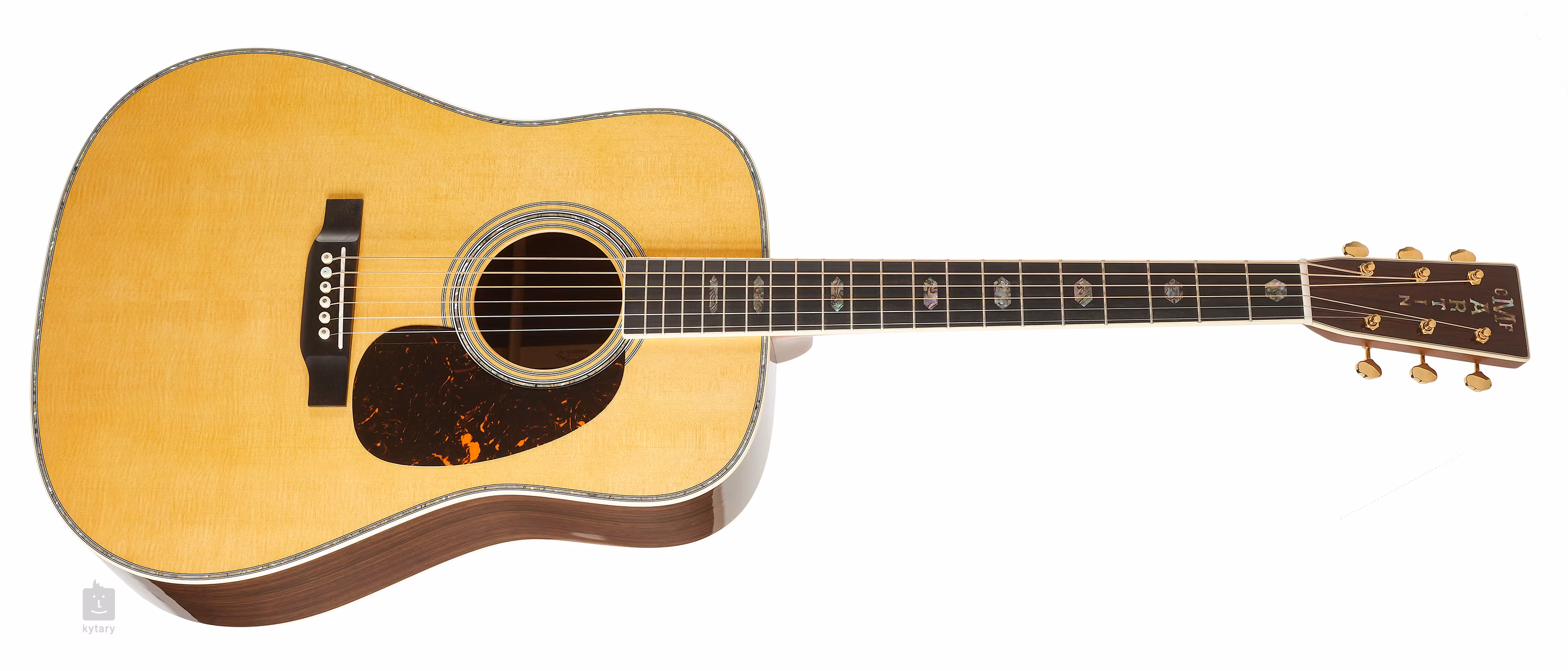 L'aspect raffiné de l'instrument est accentué par un certain nombre d'éléments décoratifs luxueux : rosace en nacre et tête en abalone, corps, touche et filets de tête en blanc antique, placage de bois de rose sur la tête avec logo de la société en nacre, chevilles Butterbean et un pickguard pratique en imitation écaille de tortue, qui protège également la laque de la guitare contre les rayures.