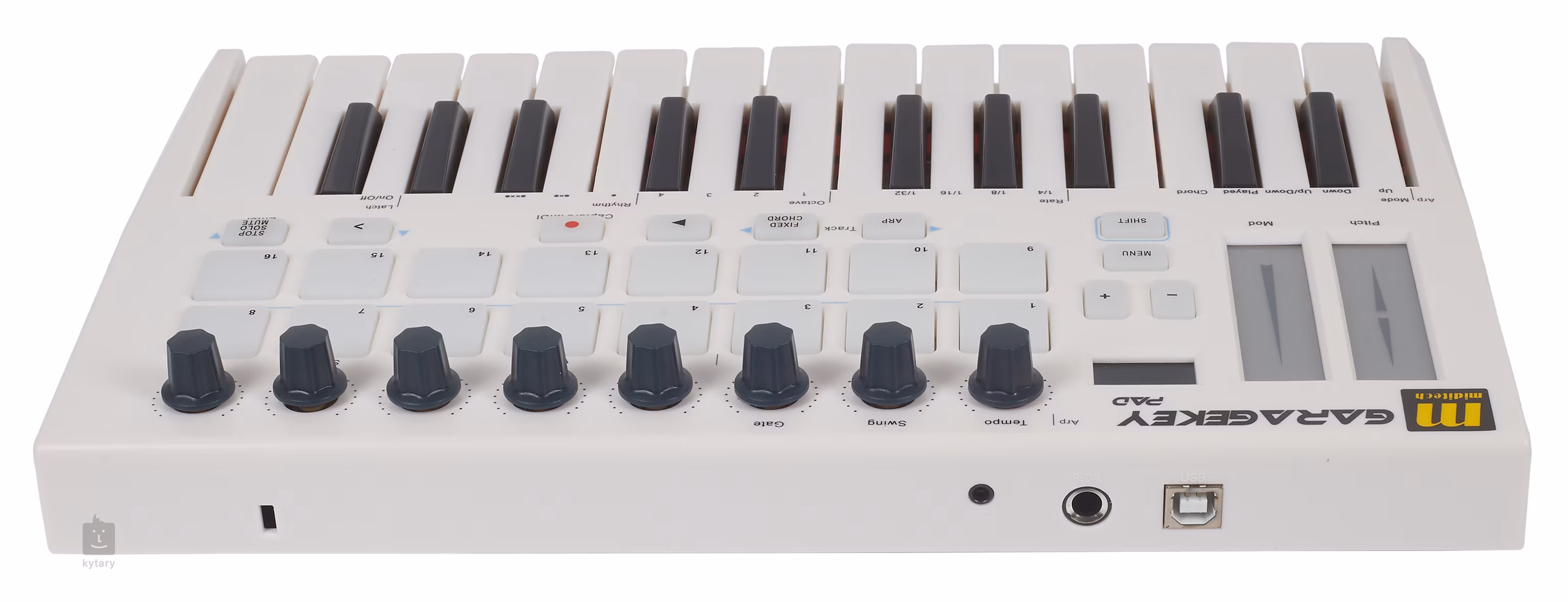 MIDITECH Garagekey PAD II est un clavier mobile pratique pour les voyages. Il possède vingt-cinq touches dynamiques. Il est compatible avec la plupart des programmes DAW, de sorte que chaque paramètre peut être affecté à l'un des seize pads RVB avec point de pression réglable ou à l'un des huit boutons. Pour régler la hauteur du son, il existe une commande dite à ruban qui est actionnée par un glissement de doigt. Un écran OLED clair est utilisé pour faciliter l'orientation. La sortie MIDI, l'entrée pour pédale de sustain et l'interface USB 2.0 sont un bonus.