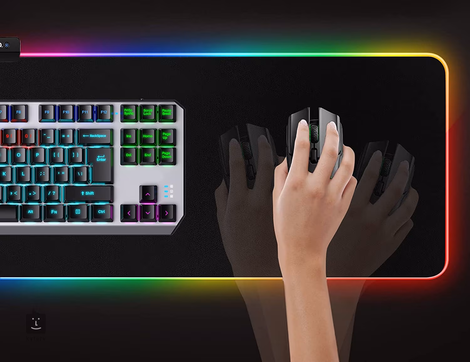 Tapis de jeu rétroéclairé élégant pour votre souris, votre clavier et les autres appareils dont vous avez besoin pour travailler sur votre ordinateur ou votre portable. Il convient aux studios d'enregistrement à domicile, aux bureaux et surtout aux joueurs passionnés qui ont besoin d'être aussi confortables que possible pendant qu'ils jouent. Le tapis est fabriqué en matériau mat et imperméable, et la partie inférieure est en caoutchouc antidérapant. Le tapis est alimenté par un câble USB et un adaptateur 5V.