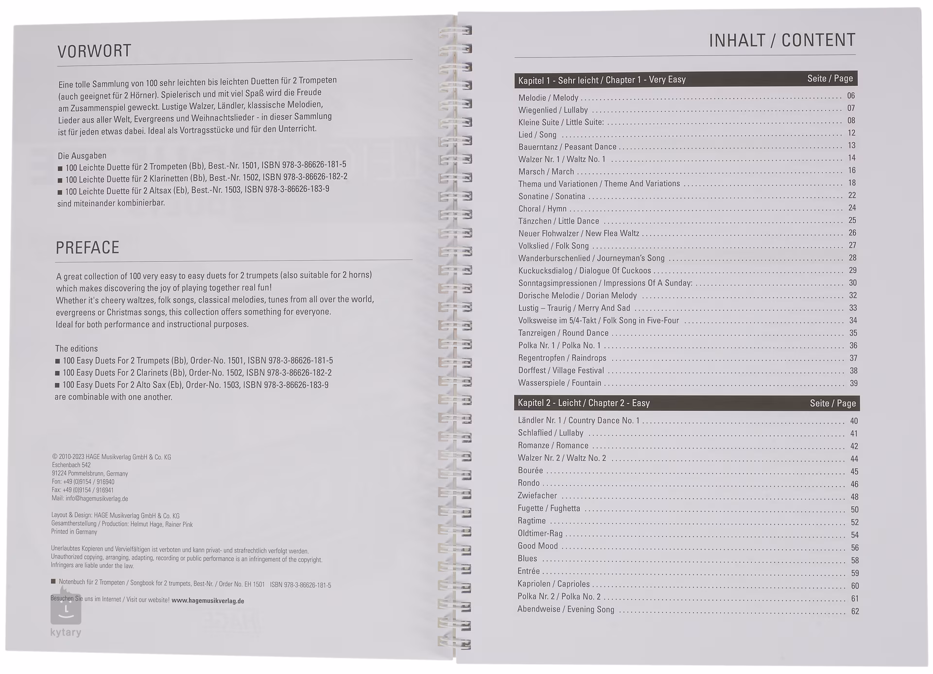 Cette publication contient une sélection de 100 duos dans des arrangements légers pour deux trompettes. Valses, chants folkloriques, mélodies de la musique classique, evergreens du monde entier et chansons/chants de Noël - il y en a pour tous les gouts. Les arrangements des morceaux conviennent pour enrichir les leçons et pour les performances.
