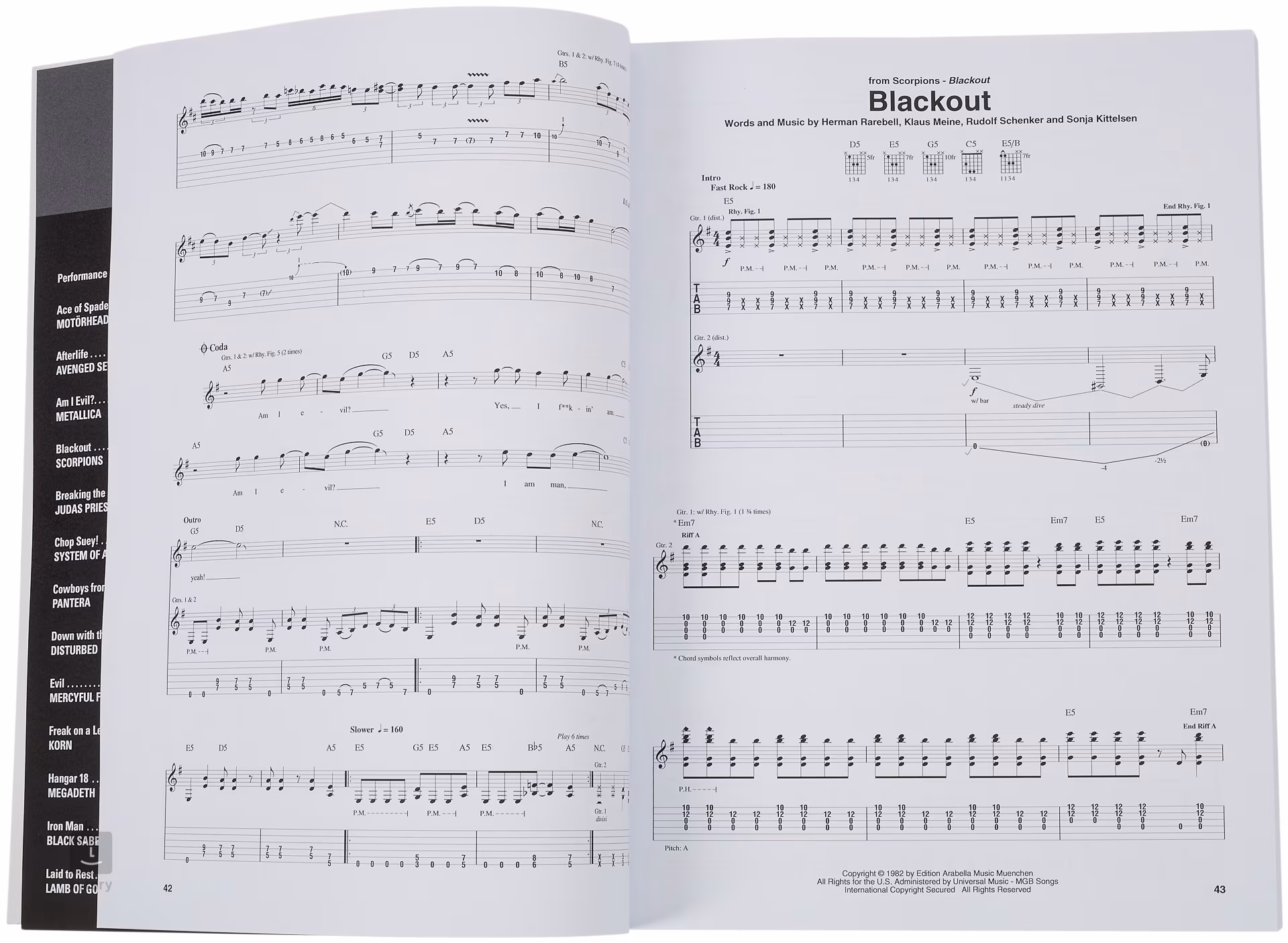 Publication 25 Top Metal Songs - Tab. Tone. Technique. contient des notes d'interprétation et des tablatures précises pour vingt-cinq succès de groupes célèbres appartenant aux catégories Hard et Heavy. Des descriptions de l'équipement de guitare, des techniques d'enregistrement et des informations historiques à la technique de la main gauche et de la main droite et à d'autres conseils utiles, vous trouverez tout ici.