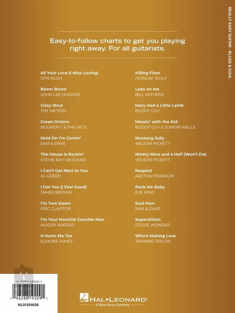 Le livre Blues & Soul - Really Easy Guitar propose vingt-deux chansons connues de soul et de blues que même un débutant complet peut jouer à la guitare. Les chansons comprennent les paroles, la tablature de guitare, les marquages d'accords et le doigté illustré de chaque accord.