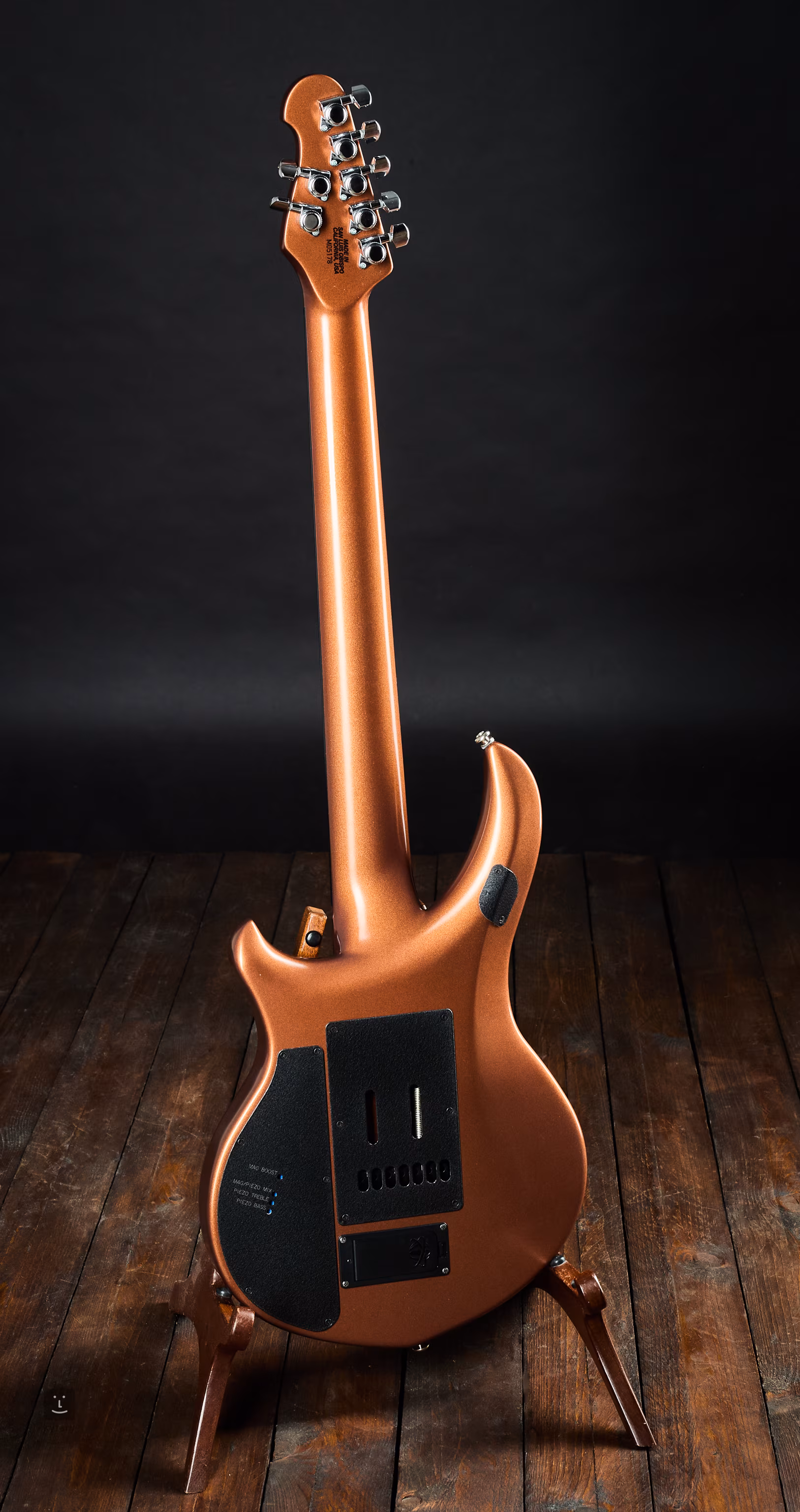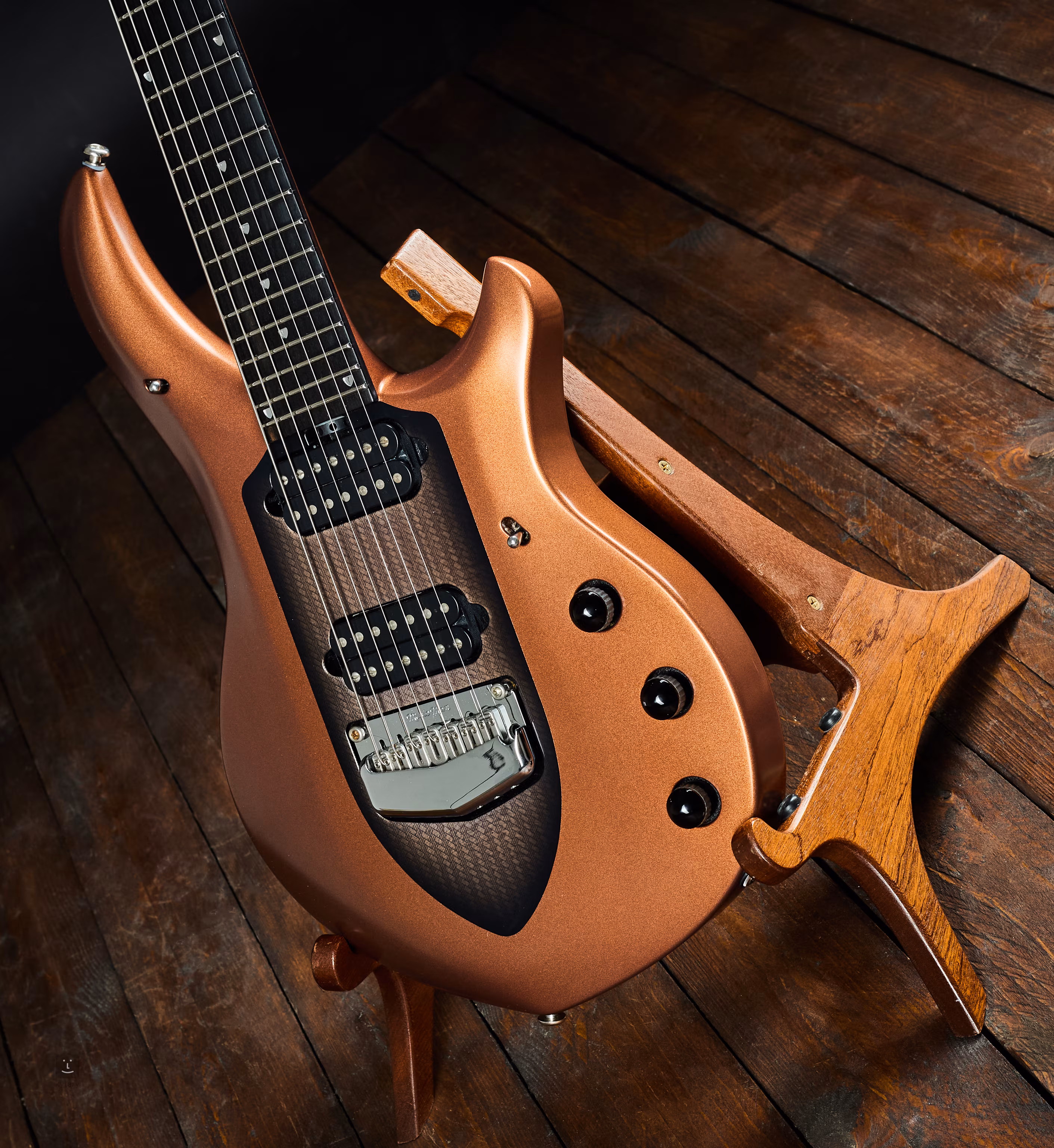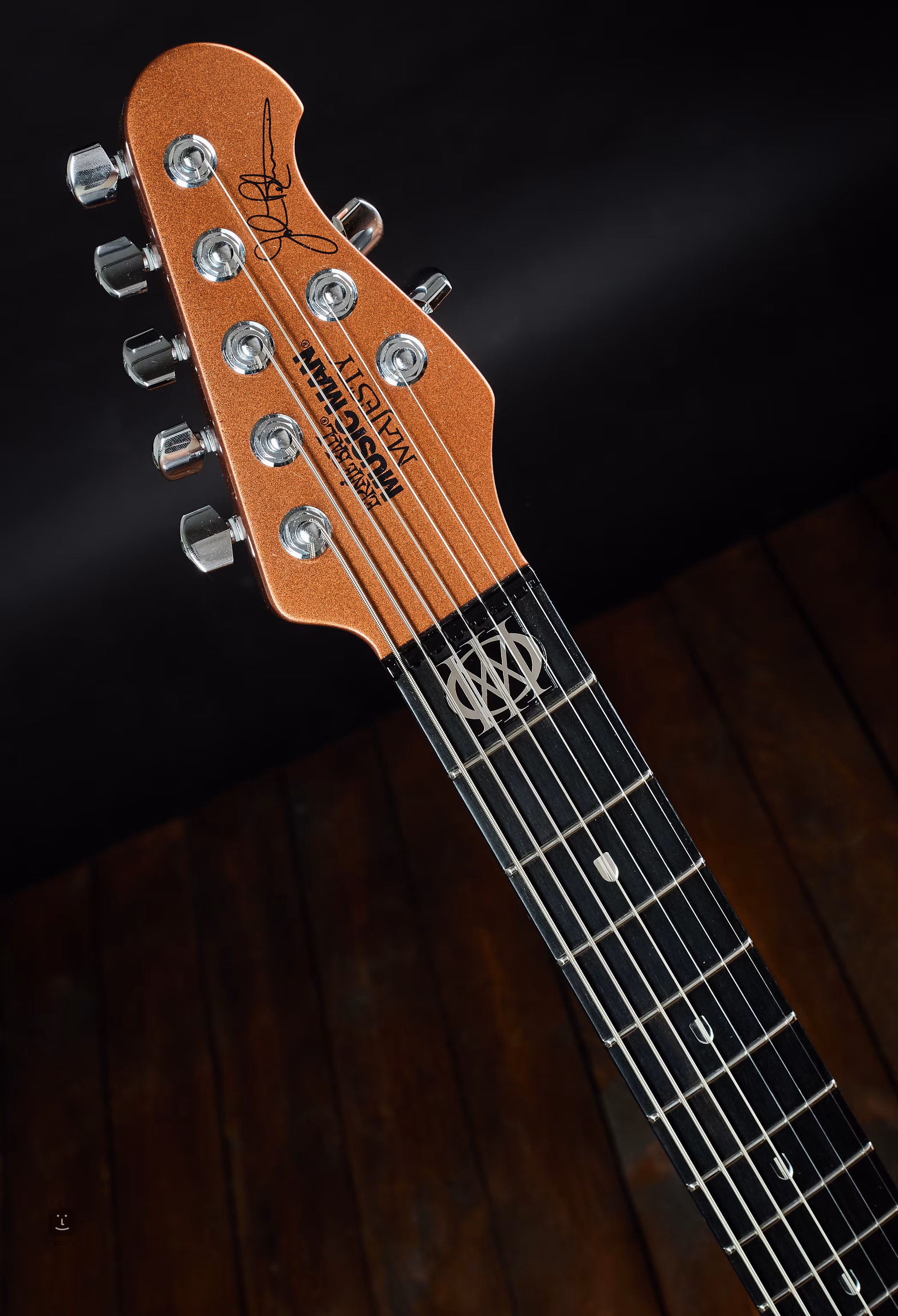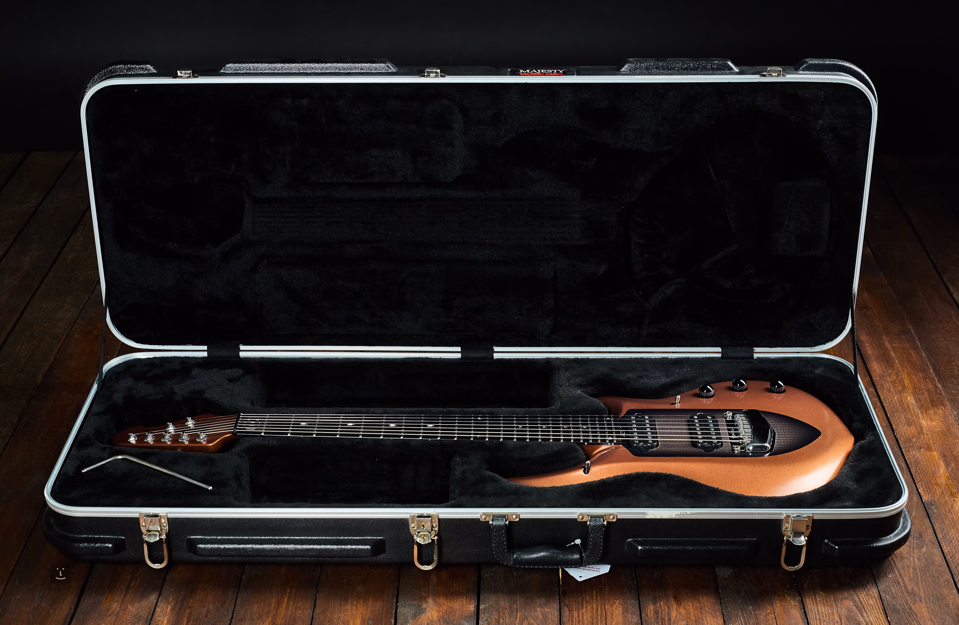 La Majesty est le fruit du travail du légendaire guitariste John Petrucci, l'un des pères fondateurs des dieux du métal Dream Theater ; un virtuose qui est peut-être né avec les doigts étalés sur la touche. Cette Majesty, comme ses consœurs, est fabriquée sans compromis, et dans cette itération 2015, elle est à sept cordes et dans un coloris Copper Fire très intéressant.