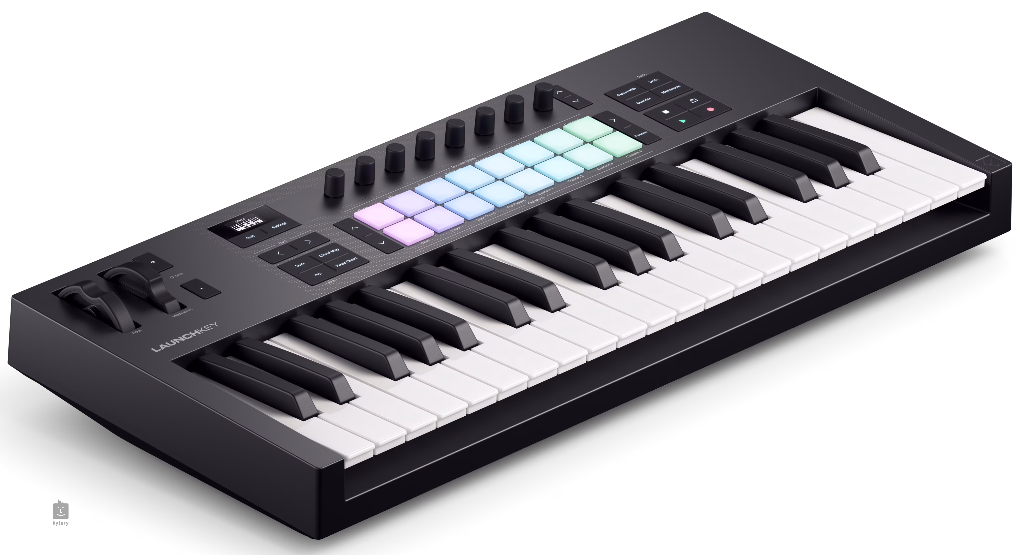 Le Launchkey 37 de Novation est un puissant contrôleur DAW doté d'un clavier de type synthé, de huit encodeurs continus et de 16 pads sensibles à la pression pour la batterie au doigt et le déclenchement de clips. Le contrôleur propose également des modes créatifs d'accords et de gammes qui fonctionnent avec l'écran OLED pour faciliter l'accordage.
