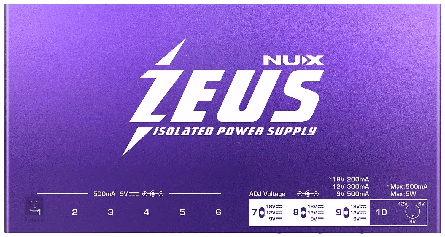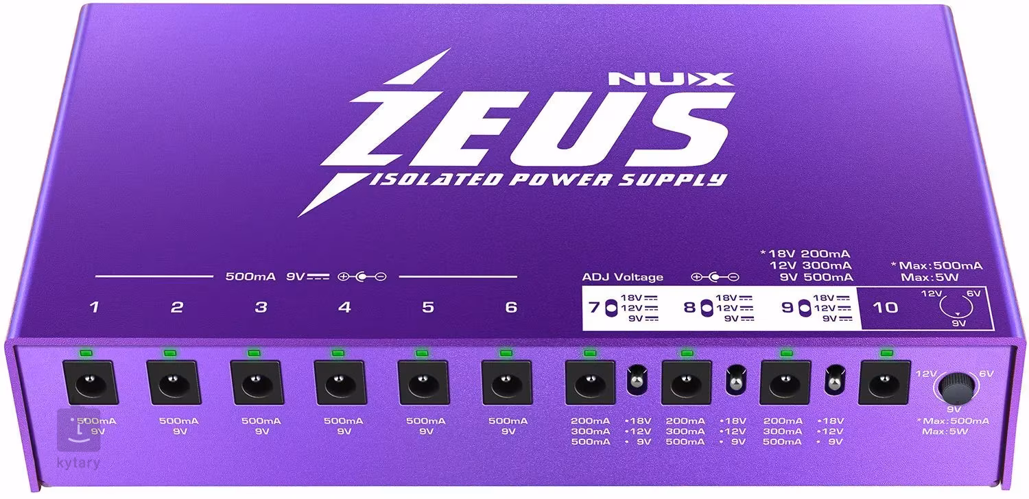 Le NIP-Z10 Zeus est un adaptateur multiple de précision conçu par NUX qui vous permet d'alimenter plusieurs effets simultanément. Il offre un total de 11 sorties isolées - six sorties standard 9V (500 mA), deux sorties commutables entre 9V (500 mA), 12V (300 mA) et 18V (200 mA), une sortie avec un courant réglable en continu de 6 à 12V (max. 500 mA) et une sortie USB 5V pour l'alimentation de votre appareil mobile. Grâce au convertisseur de tension d'entrée intégré, le Zeus est compatible avec tous les blocs d'alimentation du monde. Vous pouvez donc faire le tour du monde en toute tranquillité.