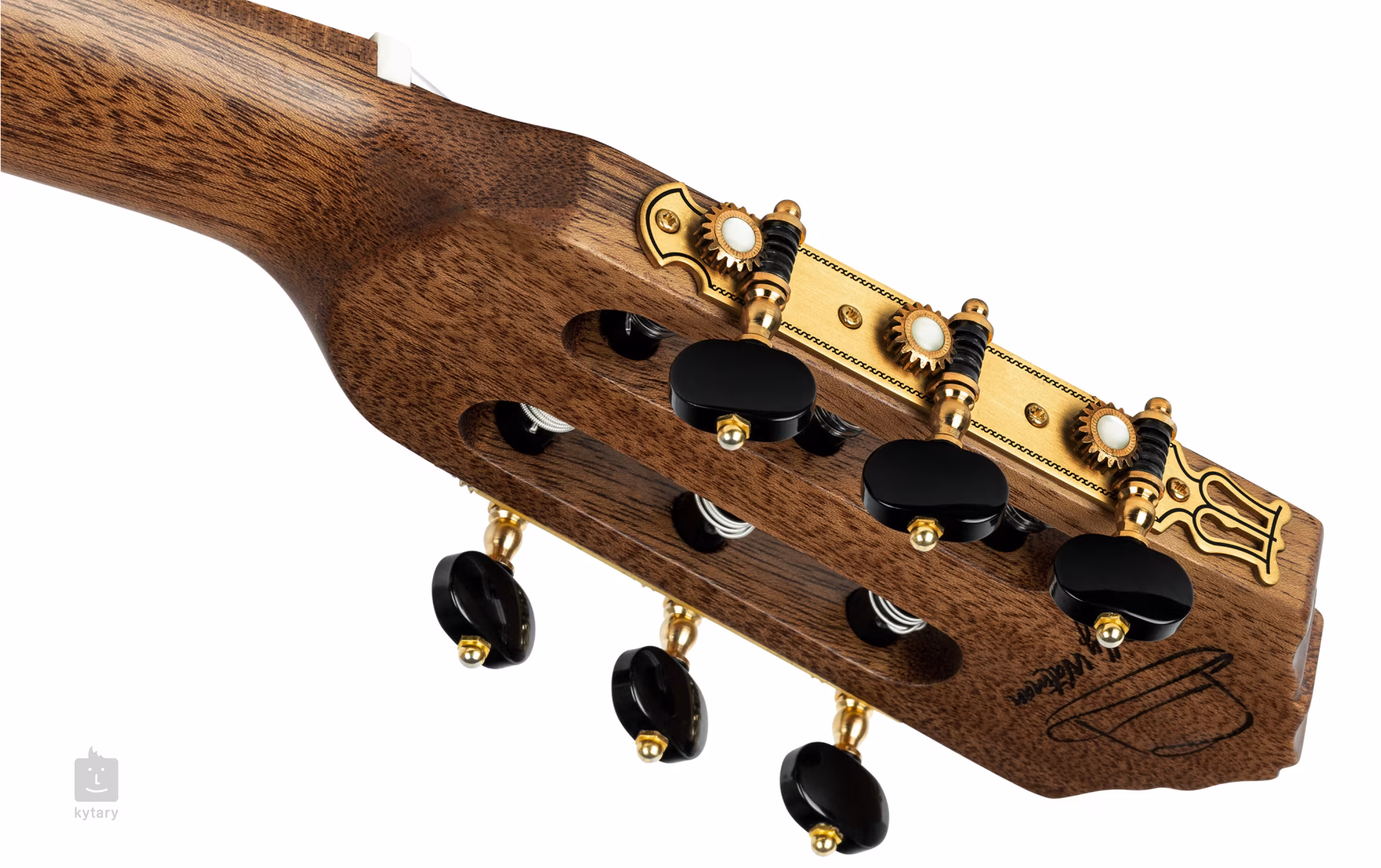 L'avant de la guitare est fabriqué en épicéa américain massif, tandis que le dos et les éclisses sont en ébène blanc sélectionné à la main avec un grain de bois exclusif. Le confort de jeu est rehaussé par l'accoudoir ergonomique et la découpe du bas du corps. Le manche plus étroit en acajou est équipé d'une touche en ébène de dix-neuf frettes. Les cordes sont montées dans les mécaniques de l'entreprise et sur la touche en ébène. La finition soignée est accentuée par la bordure en acacia du corps, la table en imitation de nacre et la rosace en bois.