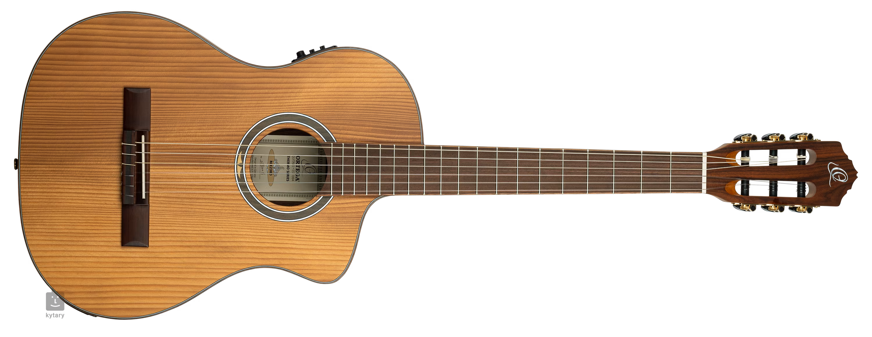 La plaque avant de la guitare électro-acoustique classique RCE23RO est en épicéa massif "cuit", tandis que la plaque arrière et les éclisses sont en pau ferro stratifié. Le manche étroit (profil extra Slim) en érable traité thermiquement est collé à une touche en jatoba "cuit" avec dix-neuf frettes. Il est intéressant de noter que l'instrument a un menu légèrement plus court (630 mm) et une frette zéro plus étroite (47 mm).