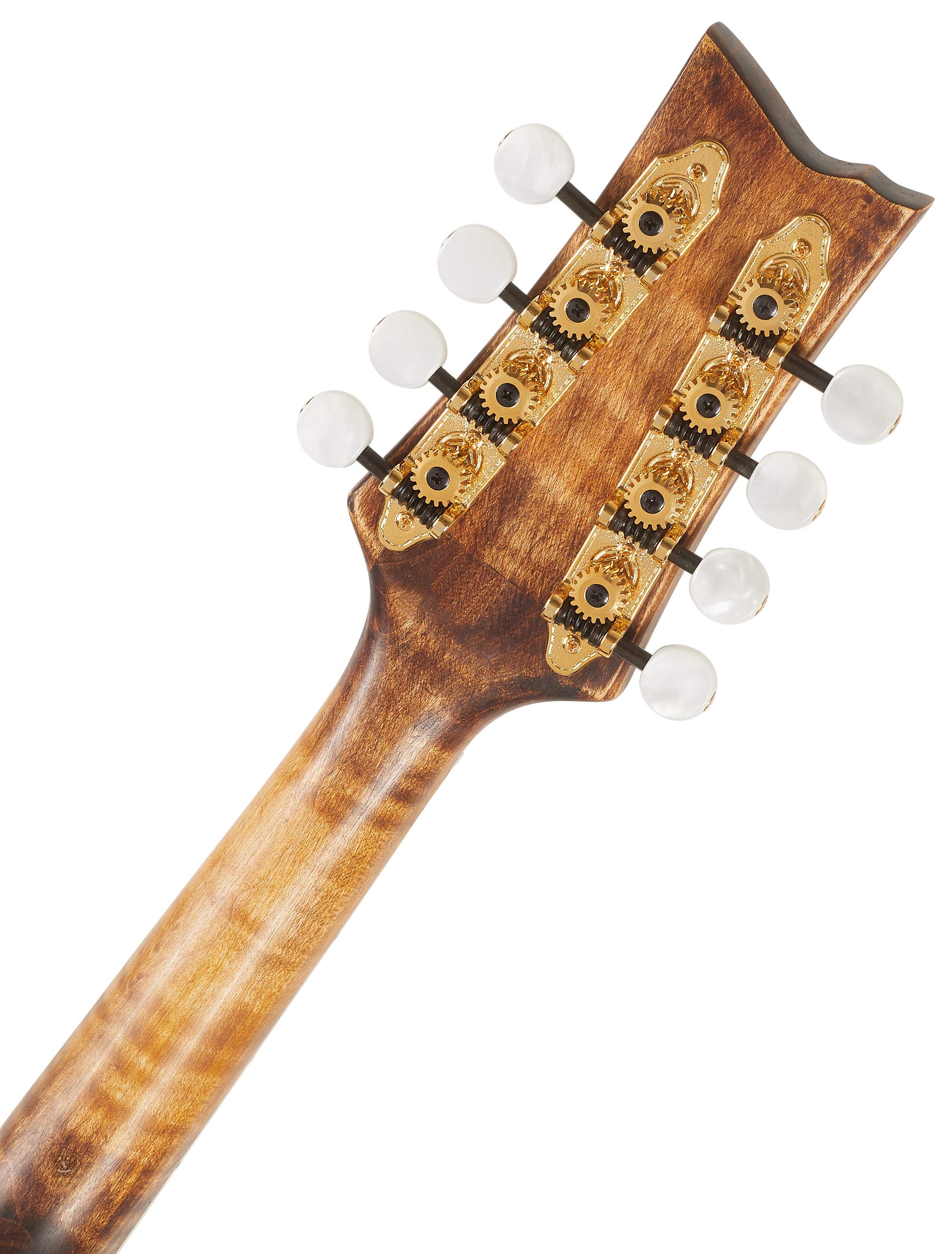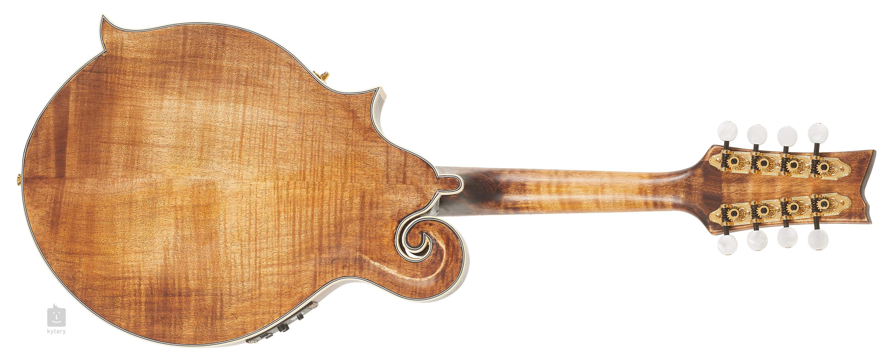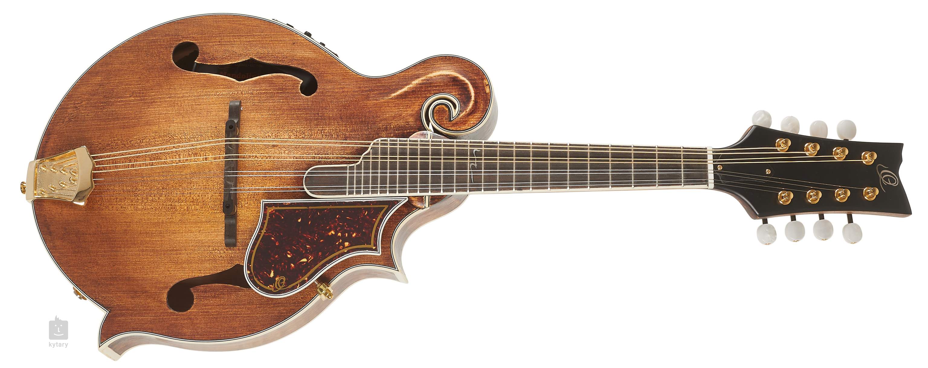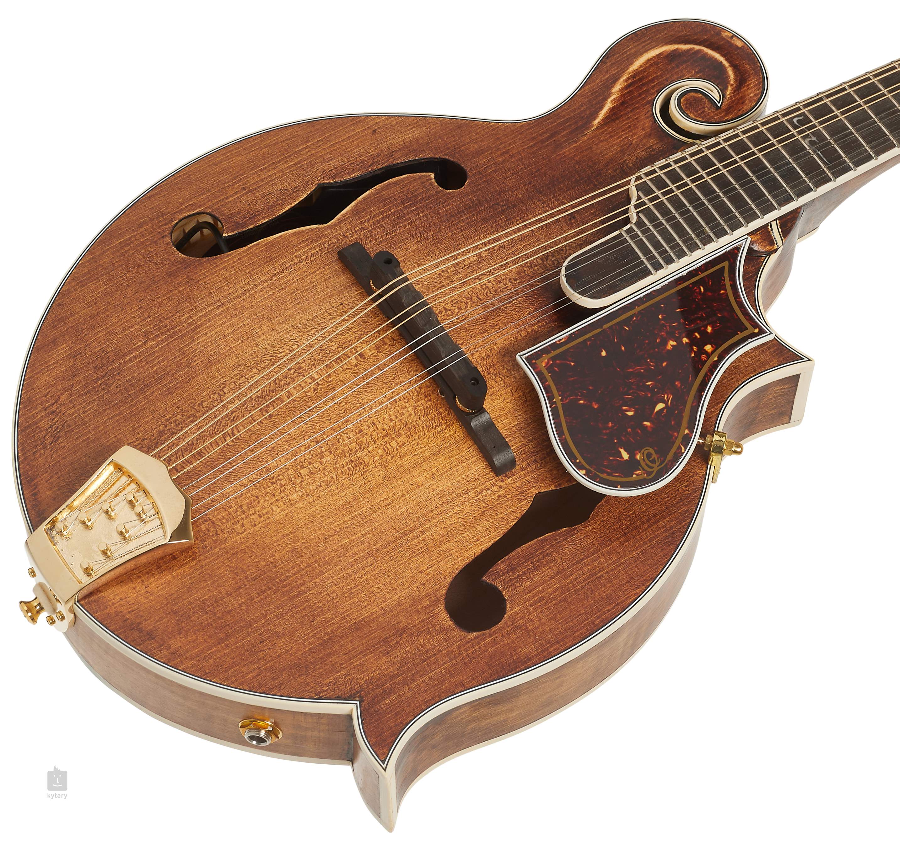 Le corps de cette mandoline F est composé d'un panneau avant en épicéa massif et d'un fond et de côtés en érable massif figuré, avec un beau grain et une finition laquée a l'huile claire. Une touche en ébene équipée de vingt-quatre frettes est collée sur un manche en érable avec une finition brillante en Tobacco Sunburst et des doubles barrettes. Les cordes sont montées sur une touche en ébene avec des mécaniques Grover plaquées or et un manche monobloc moulé sous pression en finition dorée.