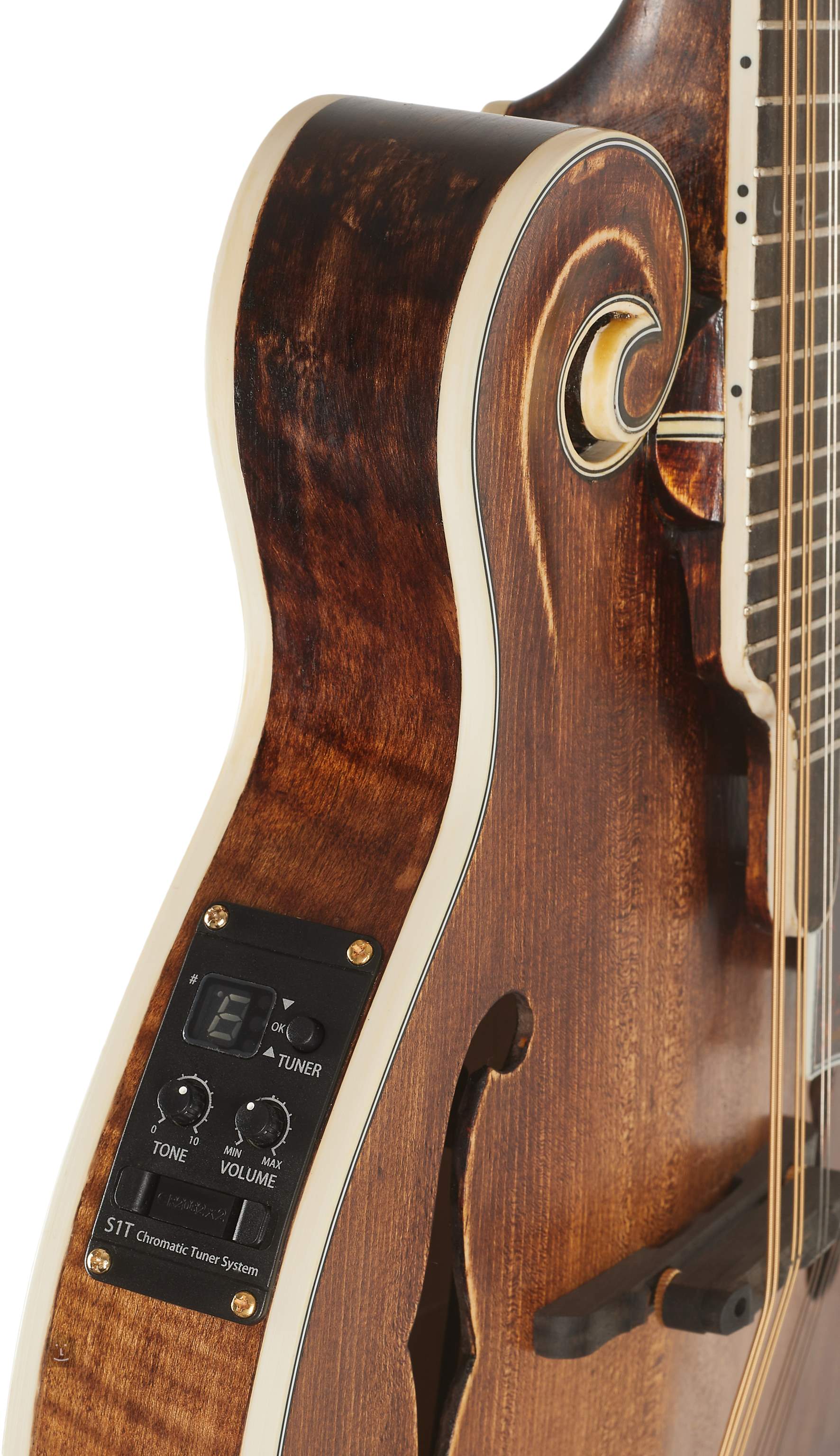 Le systeme sonore de la mandoline est assuré par un micro piézo sous la cloche a vache et un préampli S1T avec des commandes de volume, de tonalité et d'accord intégré.