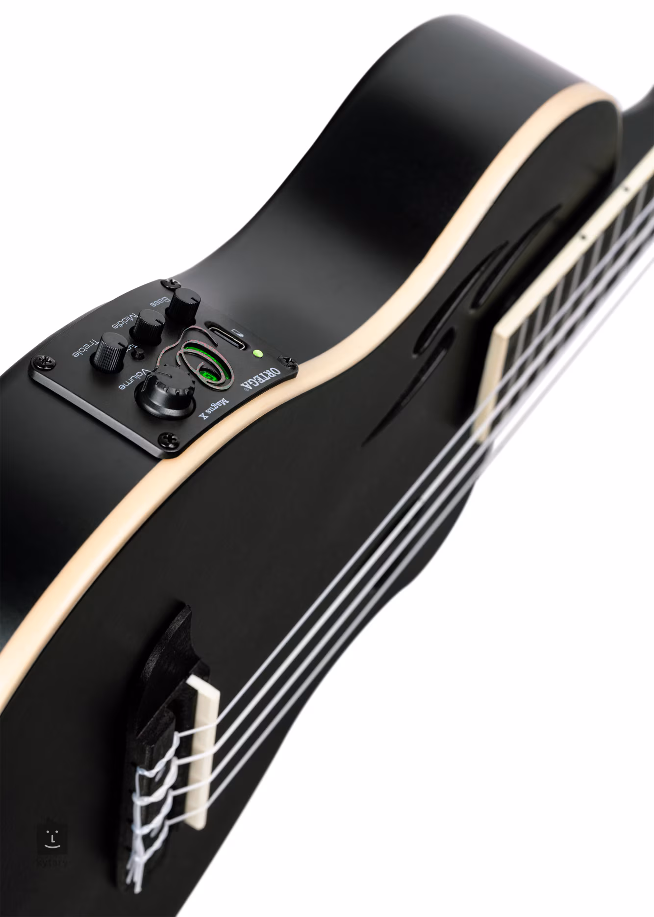 Le système sonore de l'ukulélé est assuré par l'électronique Ortega MagusX/U située à l'arrière de l'instrument, avec un égaliseur à trois bandes, un contrôle du volume et un accordeur intégré. Il suffit de charger la batterie intégrée à l'aide du câble USB-C inclus. Les cordes sont logées dans les mécaniques ouvertes de l'entreprise et la touche en purpleheart.