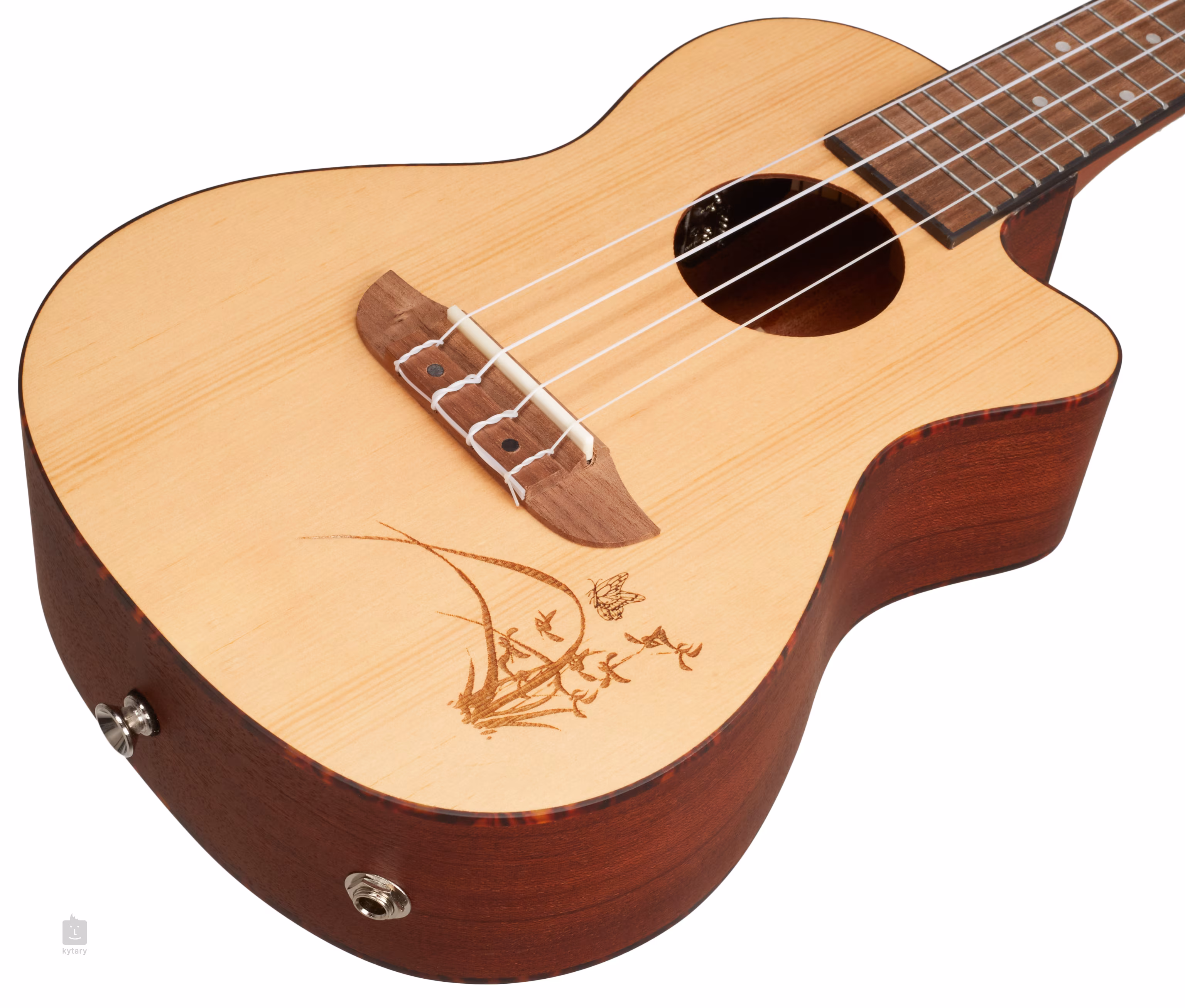 Le corps stratifié de l'ukulélé de concert RU5CE est en épicéa stratifié et le dos et les éclisses sont en sapelli stratifié. La plaque frontale est décorée d'une gravure au laser, le corps est entouré d'une garniture en ABS. Le manche en acajou est relié à une touche en noyer avec dix-huit frettes, et des points de positionnement facilitent la navigation. Les cordes sont montées sur une touche en noyer et des mécaniques fermées de type guitare (Die-Cast).