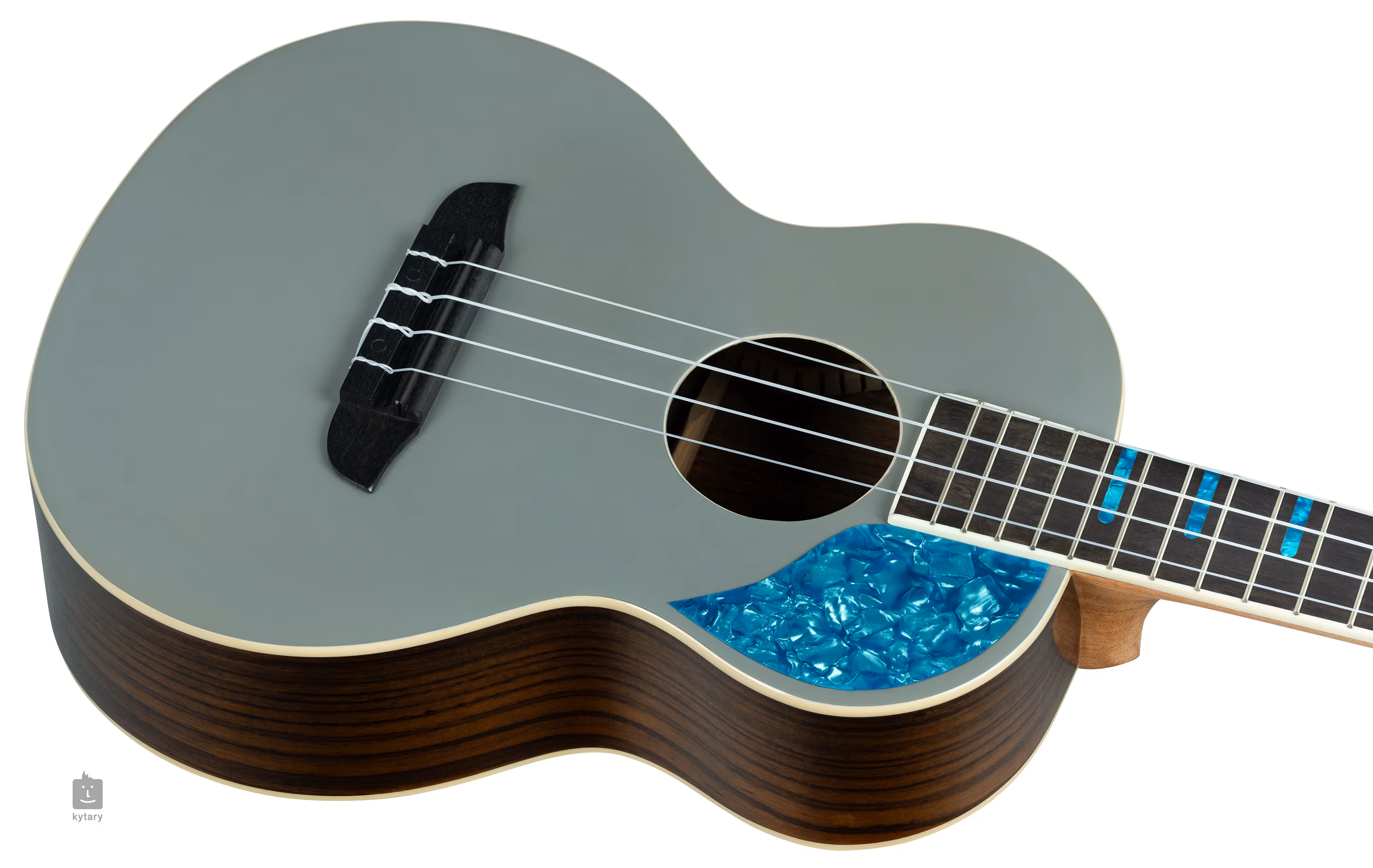 L'Ortega RUGH-PLT est un ukulélé acoustique ténor de la série Ghost. L'avant de l'instrument est fabriqué en épicéa massif, complété par un revêtement en palissandre visuellement spectaculaire sur le dos et les éclisses. Le palissandre est mis en valeur par une finition laquée brillante, tandis que la table d'harmonie est ornée d'une finition Gloss Platinum et d'un impressionnant pickguard "blue pearl".