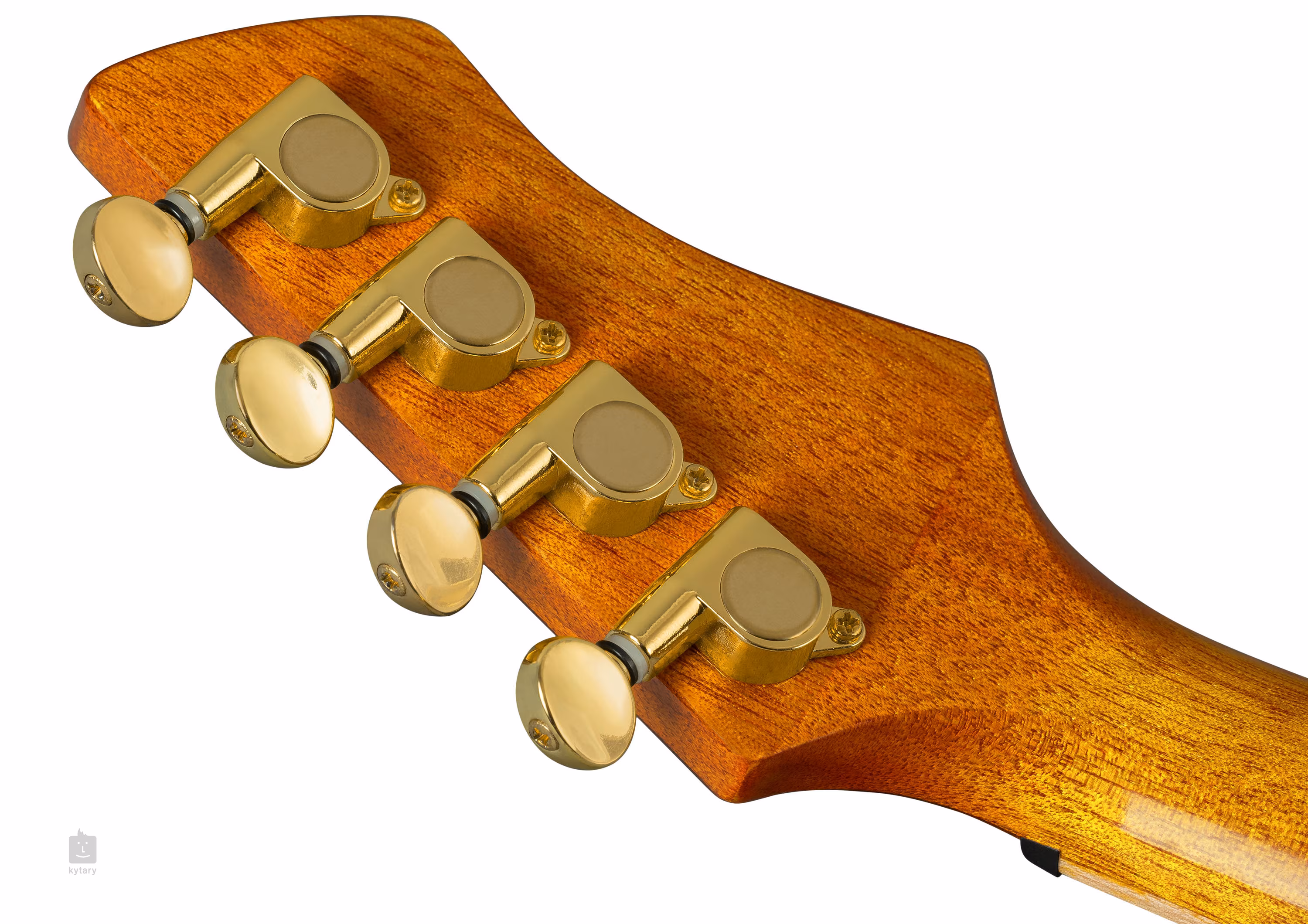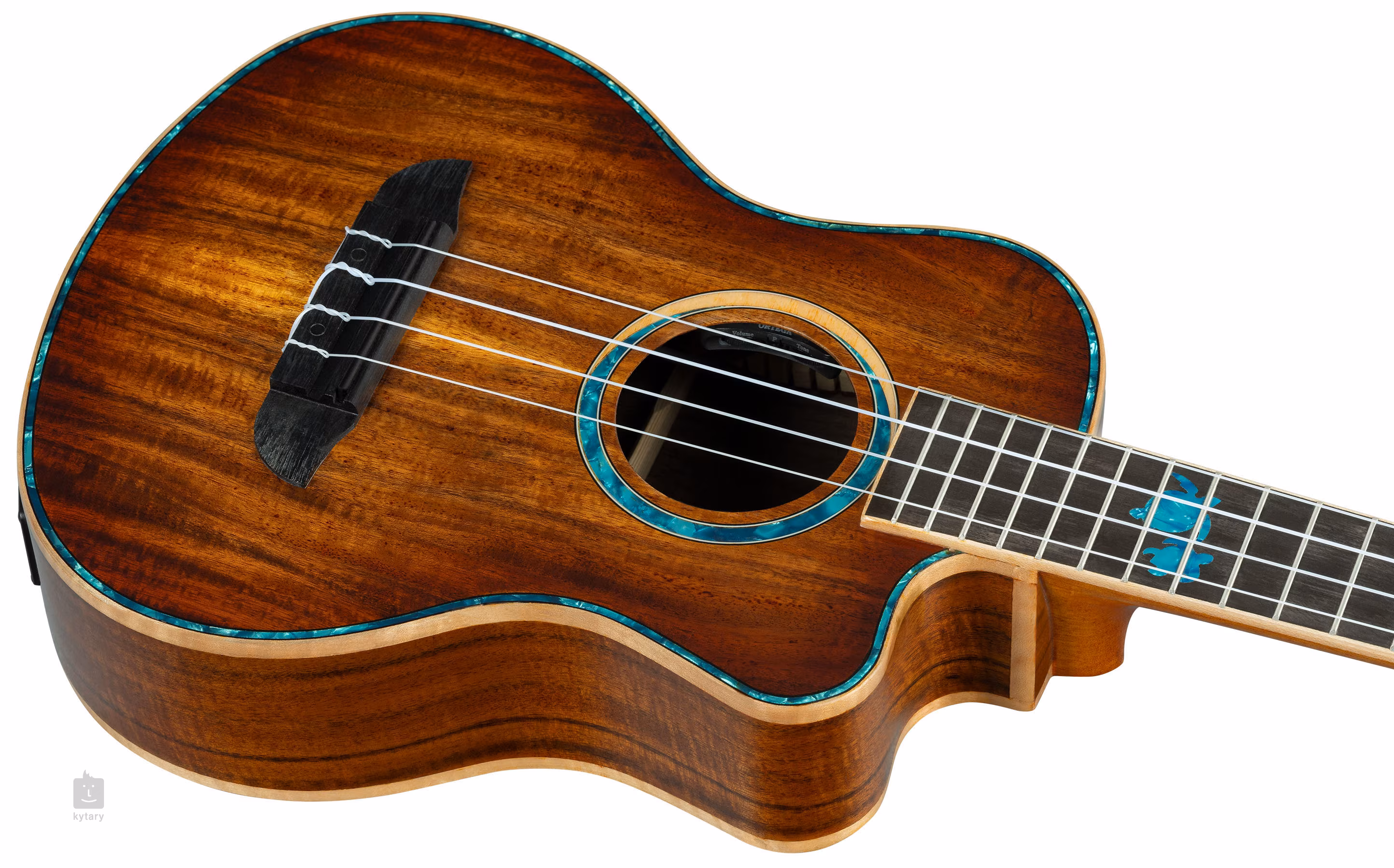 Les cordes sont montées sur des mécaniques moulées sous pression avec une finition dorée et une touche en ébène. L'aspect raffiné de l'ukulélé est accentué par la bordure du corps en érable figuré, complétée par une incrustation de nacre bleue, une rosace composée de nacre bleue et d'anneaux d'érable, et un placage d'acacia sur la tête de l'instrument.