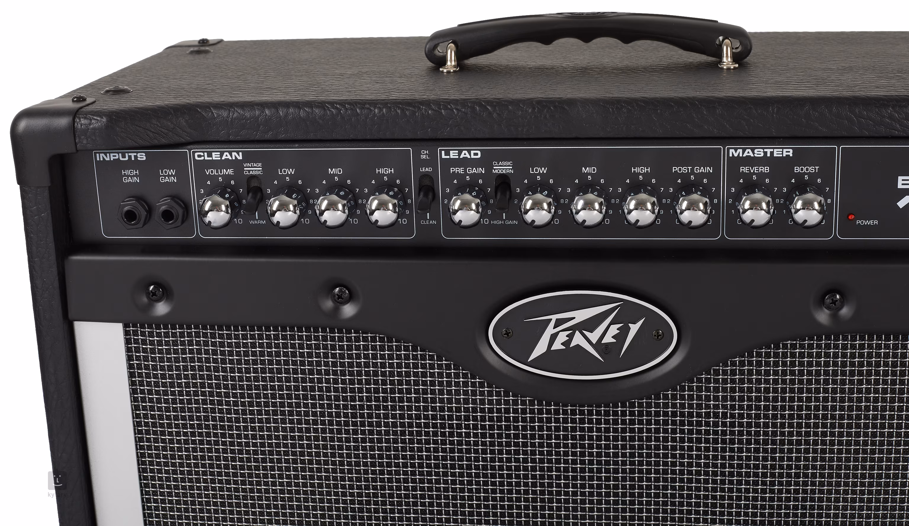 Les commandes sont situées sur le panneau avant. La, juste derriere les deux entrées a sensibilité différente, vous trouverez le potentiometre de volume du canal clair, suivi d'un égaliseur 3 bandes composé de potentiometres Low, Mid et High, en plus duquel le canal clair peut etre commuté entre les modes Vintage, Classic et Warm. Le canal de distorsion est contrôlé par le Pre-Gain et le Post-Gain et bien sur aussi par l'égaliseur 3 bandes, pour ce canal vous pouvez travailler avec les modes Classic, Modern et High Gain. Les commandes de réverbération et d'amplification sont situées dans la section maître de l'appareil.