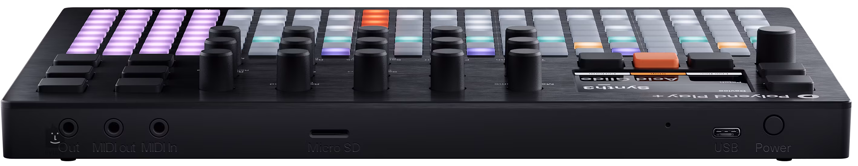 Contrôle et connectivité Votre production musicale sera grandement accélérée par un écran multi-niveaux avec quinze boutons tactiles, des pads rétro-éclairés 16x8 et des pads de contrôle 4x8 pour la saisie de notes Mute, Solo, Varation, Select ou Keyboard. La face arriere comprend ensuite une entrée/sortie MIDI, une sortie ligne, un emplacement pour carte MicroSD (carte de 16 Go incluse) et des ports USB. Sont également inclus un adaptateur USB-A vers prise, un câble USB-C, un câble stéréo vers 2x mono, un adaptateur Minijack vers DIN MIDI, une carte mémoire et un adaptateur MicroSD vers USB-A.