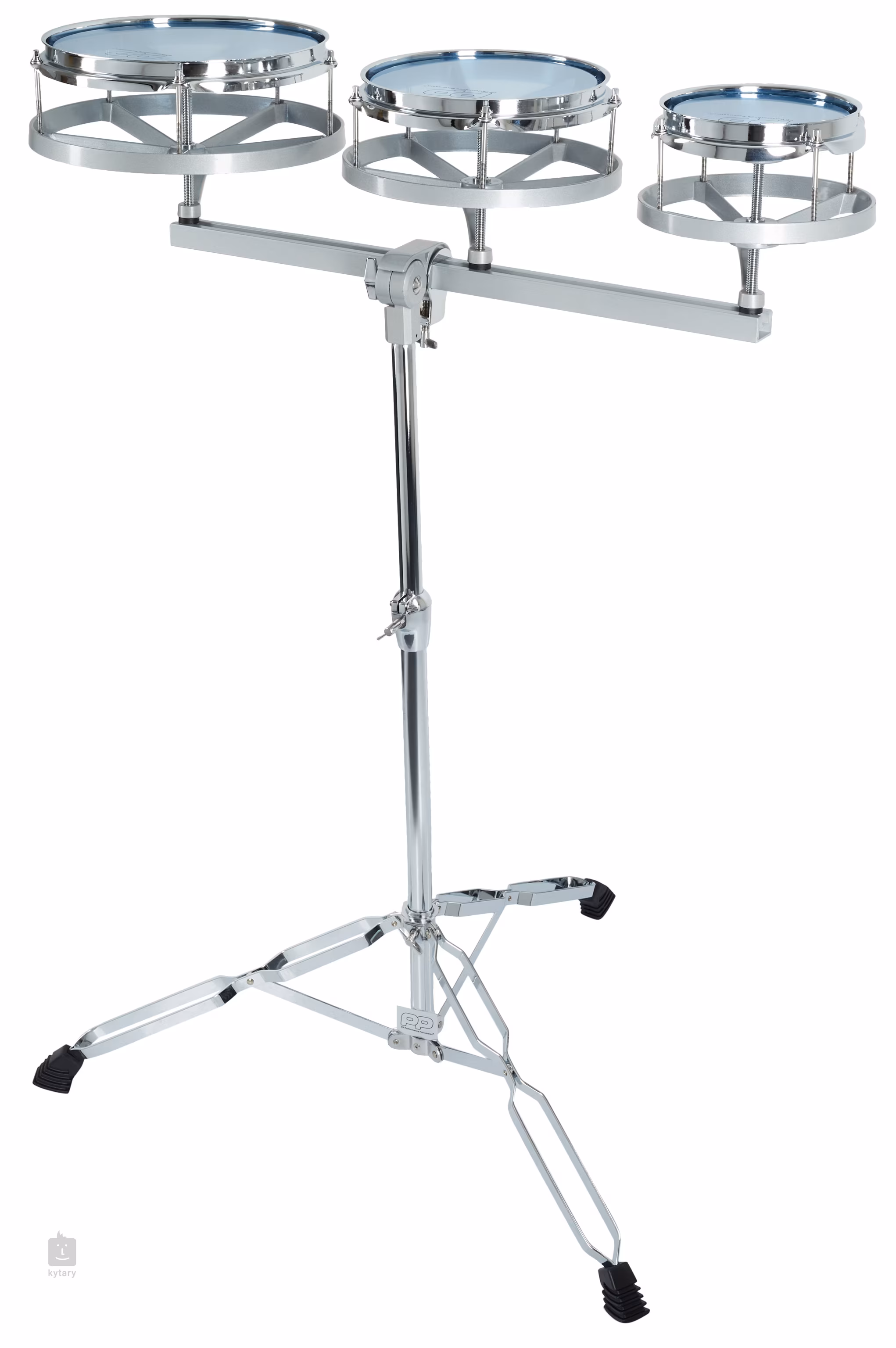 Ensemble de trois toms avec armatures métalliques perchées sur un trépied chromé, entièrement réglable avec des pieds en caoutchouc pour éviter tout glissement indésirable. La hauteur maximale est de 107 cm et la minimale est de 76,2 cm.