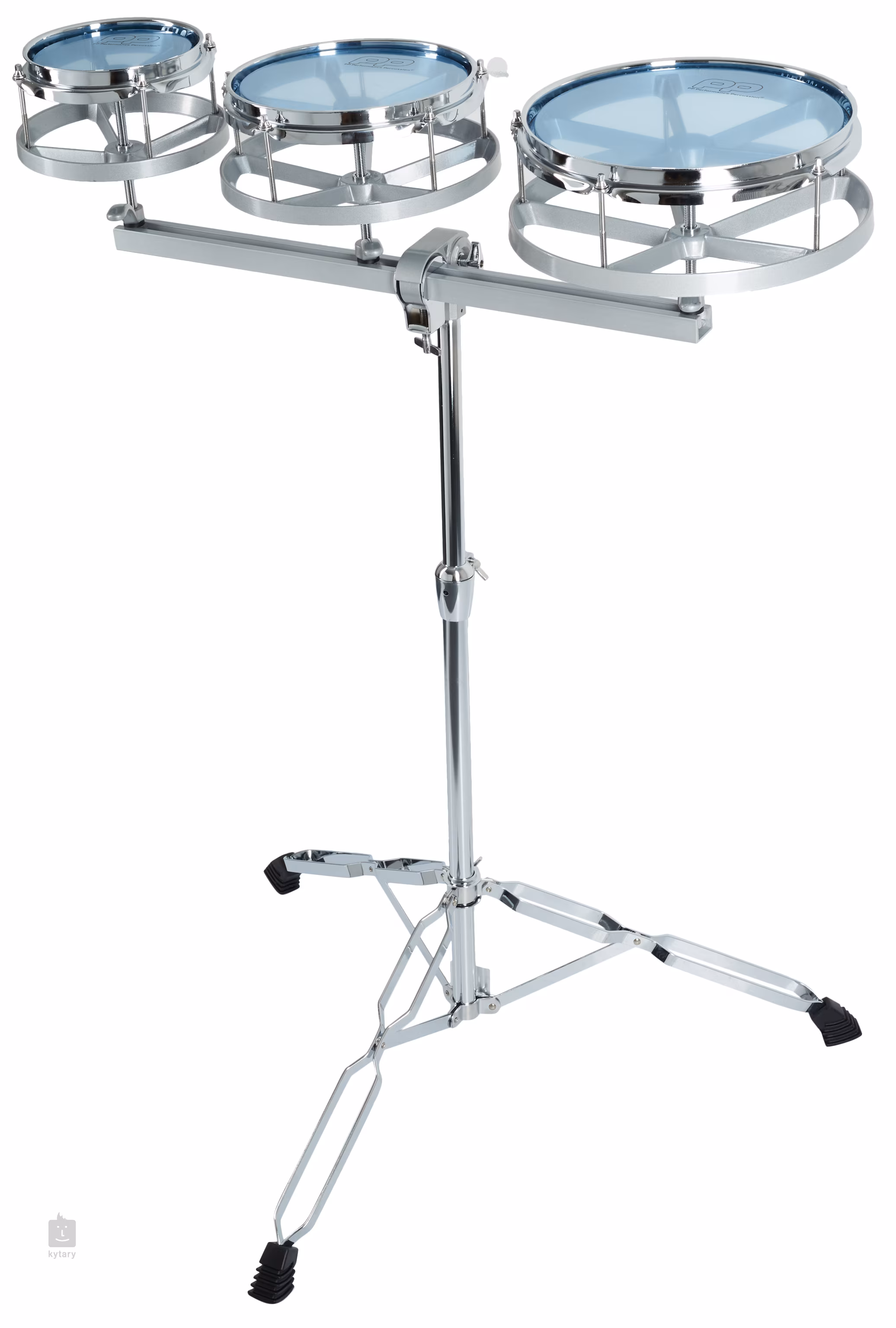 Ensemble de trois toms avec armatures métalliques perchées sur un trépied chromé, entièrement réglable avec des pieds en caoutchouc pour éviter tout glissement indésirable. La hauteur maximale est de 107 cm et la minimale est de 76,2 cm.