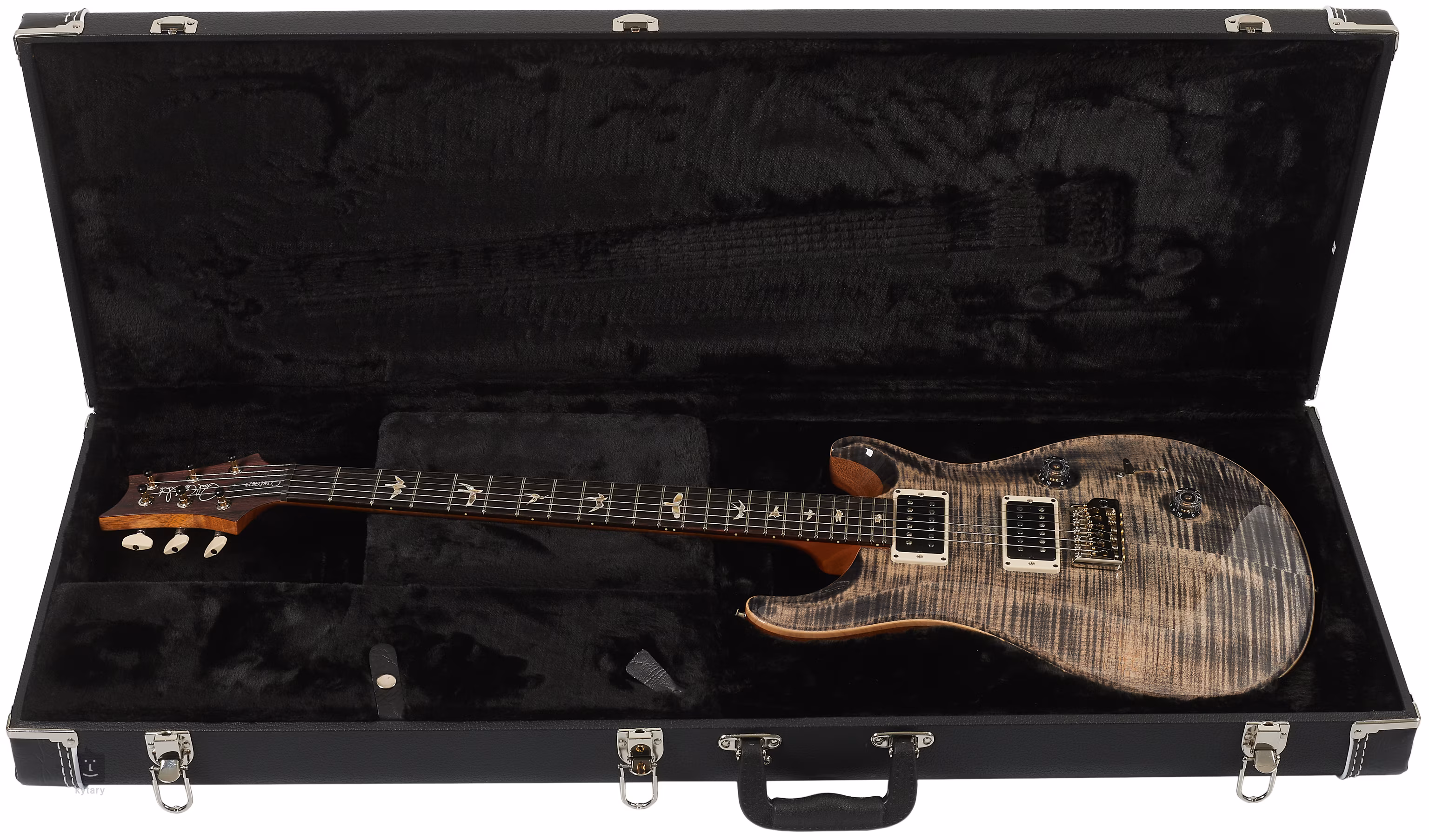 Le modèle Custom 24 Charcoal attire l'attention au premier coup d'œil grâce à la combinaison d'un corps ergonomique en acajou avec le double cutaway typique de PRS et d'une table en érable figuré avec un grain de bois froid. Un manche monobloc en acajou au profil Pattern Thin est collé à une touche en palissandre dotée de 24 frettes. L'orientation sur la touche est facilitée par les marqueurs de position PRS en forme de silhouettes d'oiseaux en nacre.
