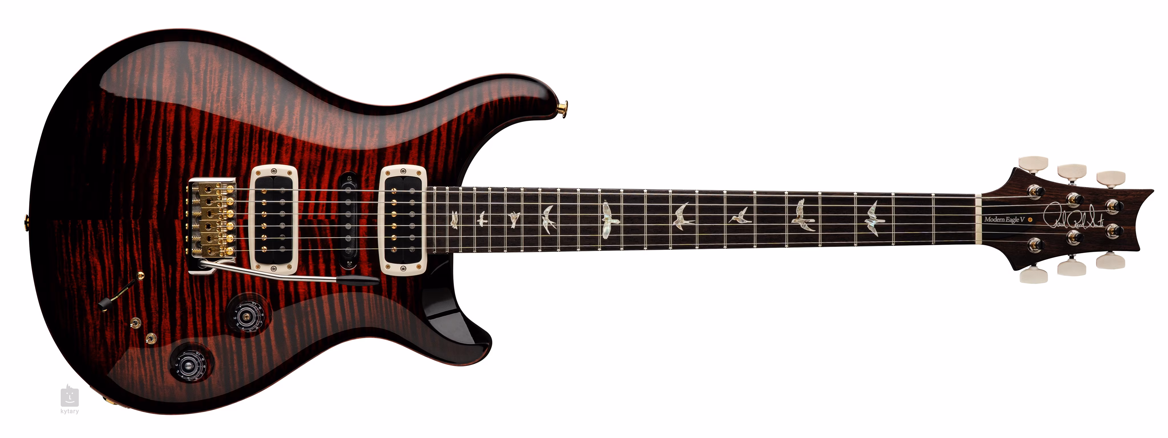 La PRS Modern Eagle V est une guitare électrique moderne au design PRS double-cut avec une configuration de micros H-S-H que vous apprécierez en studio et sur scène. Le corps ergonomique en acajou de la Modern Eagle V Fire Smokeburst est orné d'une table en érable figuré et d'une finition en laque nitro brillante. Un manche monobloc en acajou au profil Pattern est collé à une touche en palissandre dotée de vingt-deux frettes. L'orientation sur la touche est facilitée par les marqueurs de position PRS sous la forme de luxueuses silhouettes d'oiseaux en nacre.