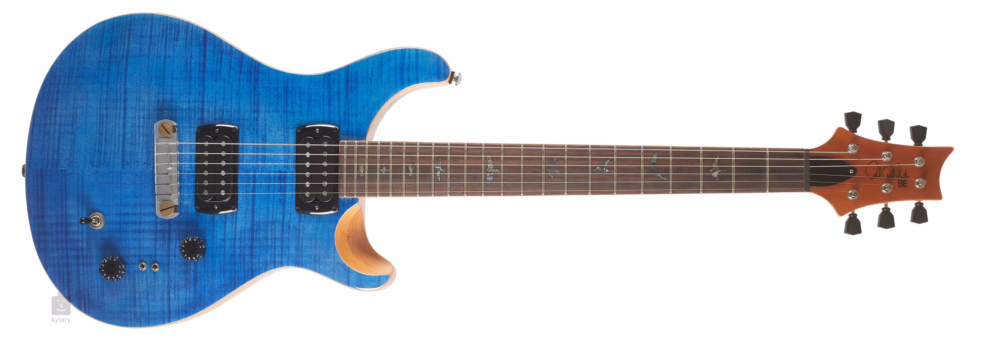 Dès le premier coup d'œil, la guitare attire l'attention grâce à son corps massif et ergonomique en acajou avec le double pan coupé typique de PRS, sa table d'harmonie en érable sculpté et son impressionnant placage en érable flammé. Le Shallow Violin carve rapproche la qualité de jeu de l'instrument des modèles plus onéreux de l'American Core Series. Un manche en acajou au profil Wide Fat est collé à un manche en palissandre doté de vingt-deux frettes et décoré des traditionnels repères de position PRS avec des silhouettes d'oiseaux.
