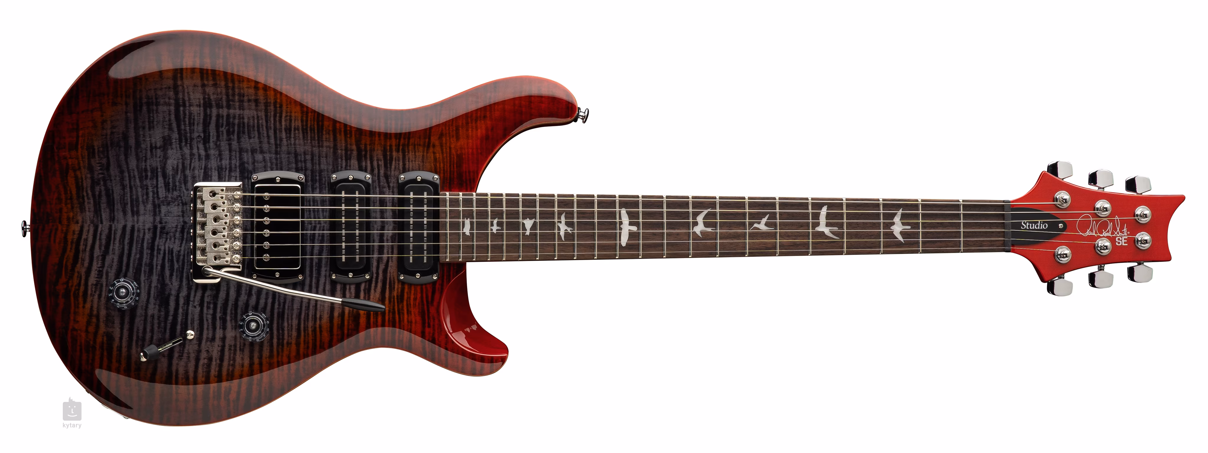 Le corps en acajou de la guitare PRS SE Studio Charcoal Cherry Burst avec le double pan coupé typique de PRS est orné d'une table en érable et d'un placage fantaisie en érable figuré. La sculpture Shallow Violin rapproche la qualité de jeu de l'instrument des modèles plus onéreux de la série American Core. Une touche en palissandre de vingt-deux frettes est collée sur un manche en érable au profil Wide Thin. L'orientation sur la touche est facilitée par les repères de position PRS en forme de silhouettes d'oiseaux.