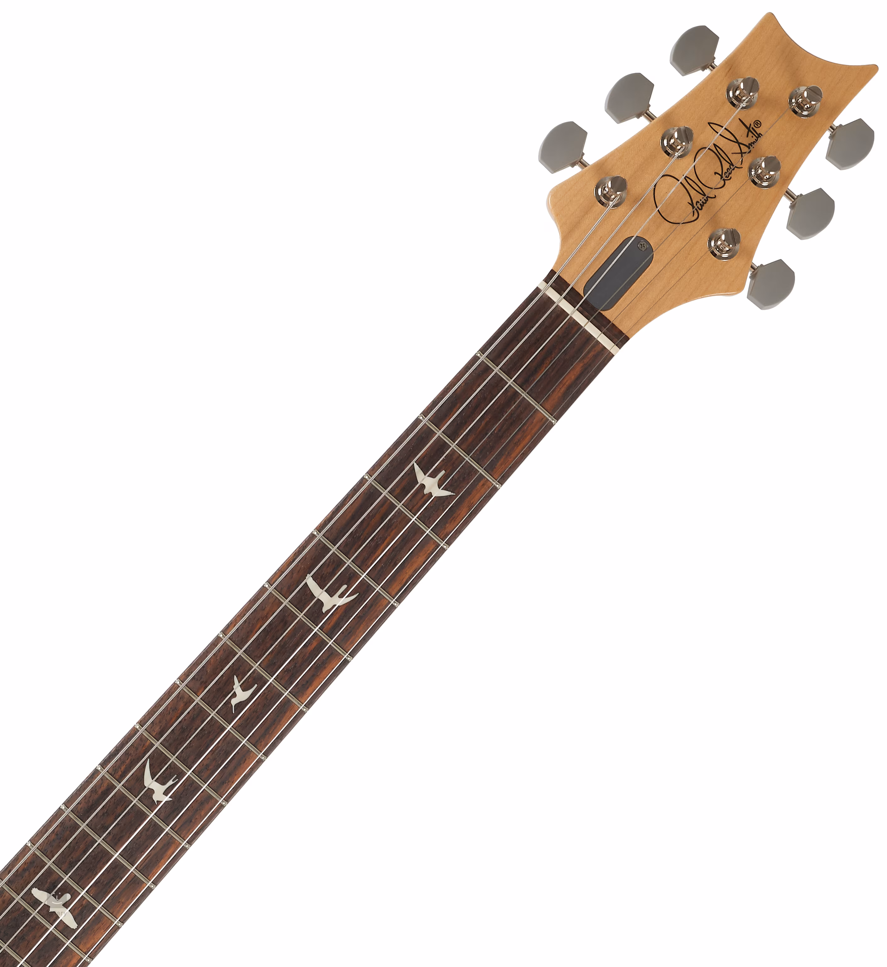 La stabilité de l'accordage est assurée par la fixation des cordes aux mécaniques verrouillables de style vintage et au trémolo en acier enrichi d'éléments PRS sous la forme d'un levier de trémolo et de vis Gen III (knife-edge). Parmi les autres spécificités de l'instrument, citons une tête avec le design inversé caractéristique de PRS, une touche en os ou une plaque de manche signée. La finition élégante est accentuée par un pickguard blanc.